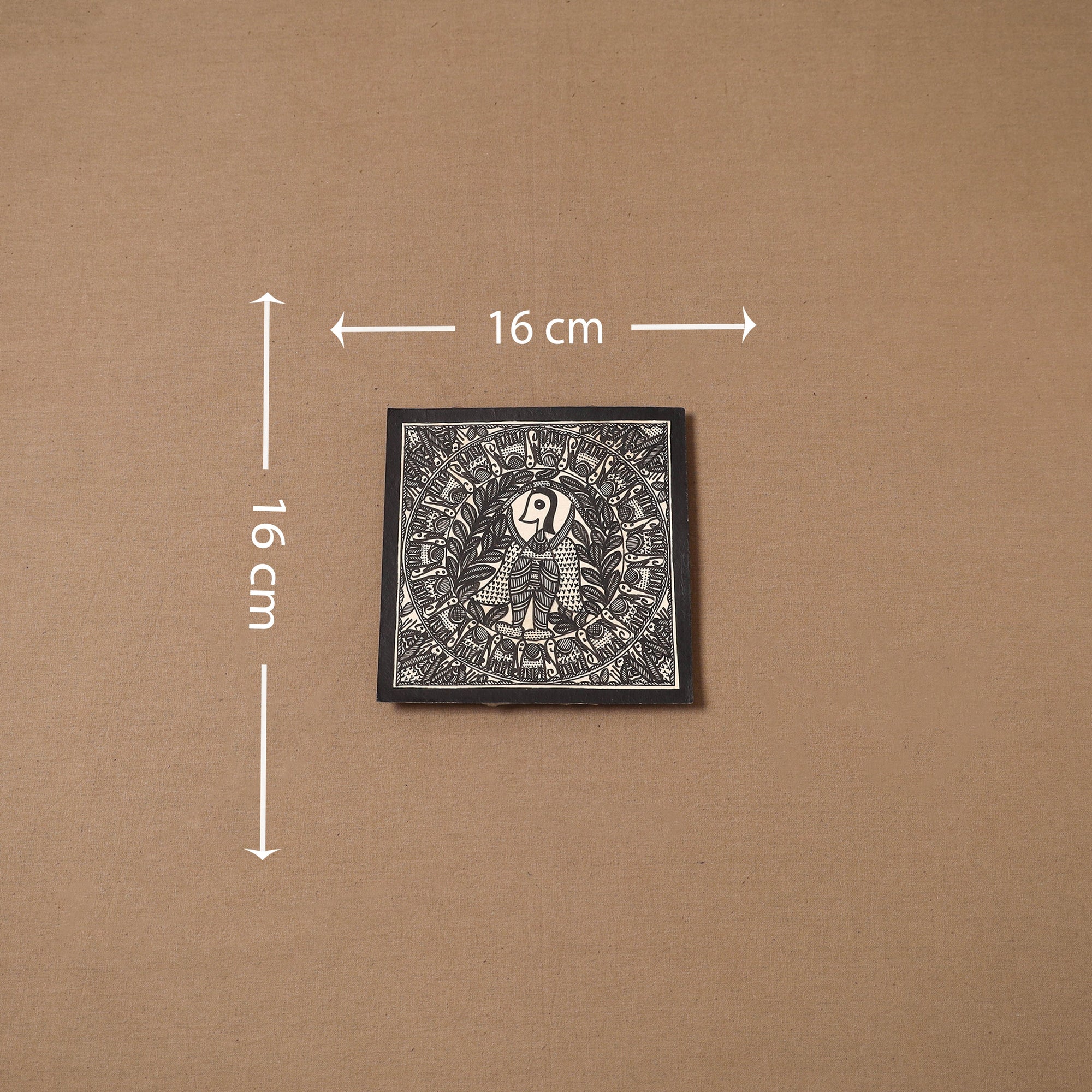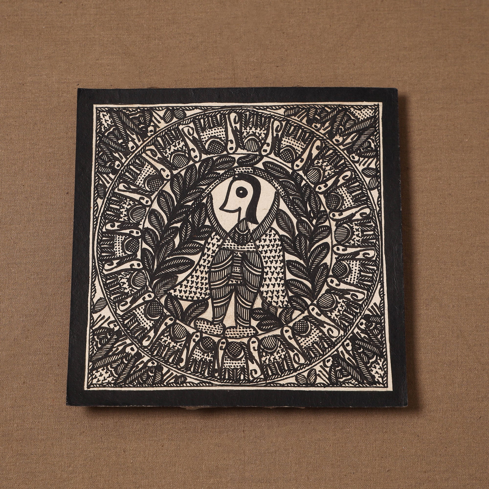 Handpainted handmade paper using natural colors and permanent ink Madhubani painting by master artisan Hira Devi from Bihar, reflecting the depth and beauty of the region’s artistic heritage. Madhubani painting, also known as Mithila art, is one of India’s most celebrated traditional art forms, known for its intricate lines, vibrant motifs, and storytelling inspired by nature and mythology. In this art, artists traditionally use fingers, twigs, and matchstick-like tools to create detailed patterns.