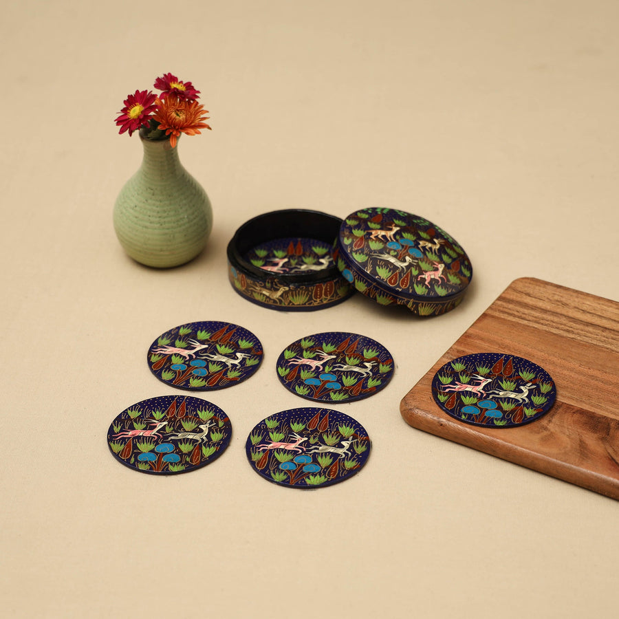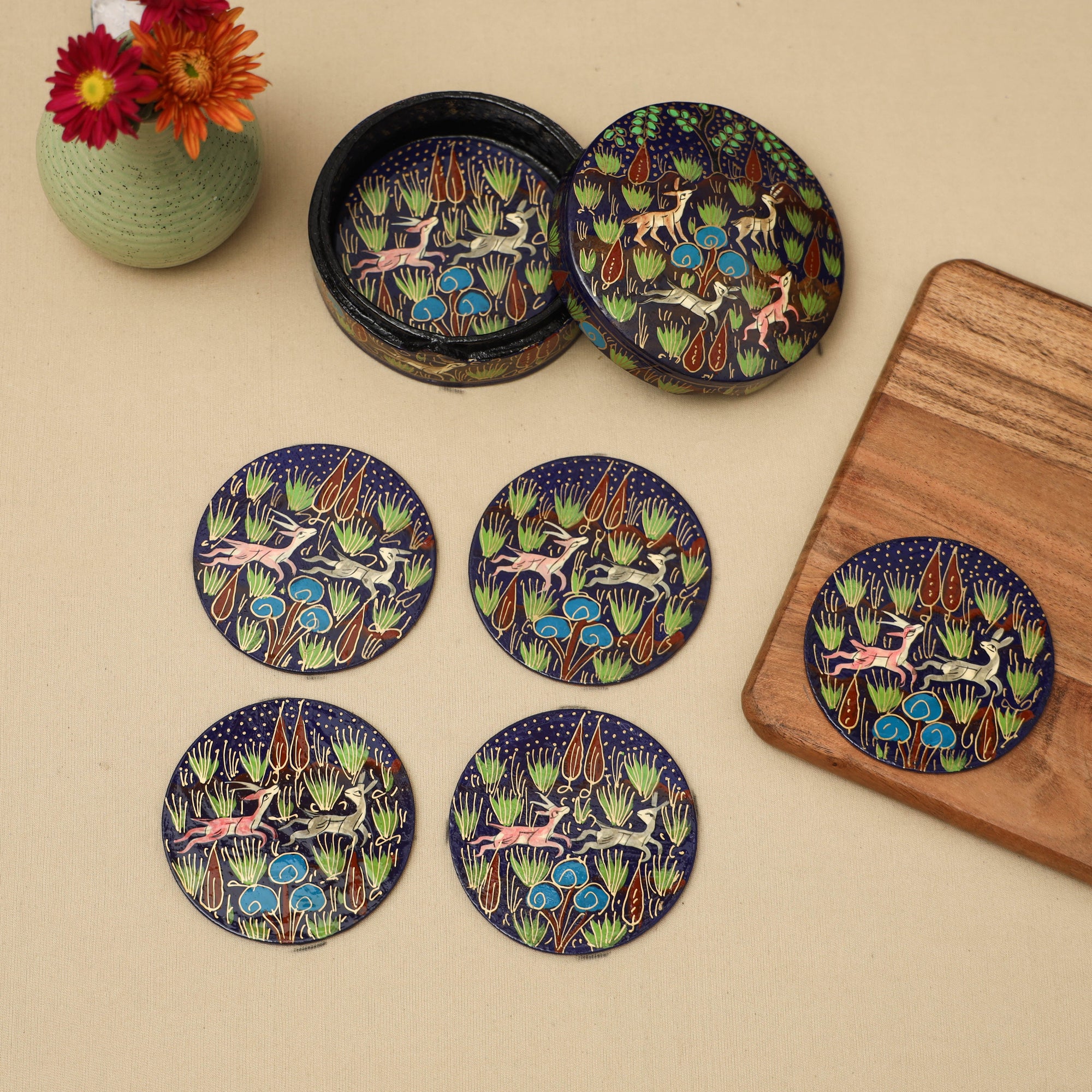 Blue paper mache box with coaster set adds a charming touch to any space with its beautifully hand-painted acrylic details. The box is crafted from sustainable paper mache made using waste paper and glue, making it an eco-friendly decor piece. The coasters are made from sturdy MDF wood and painted to match, creating a stylish, coordinated set perfect for everyday use or gifting.