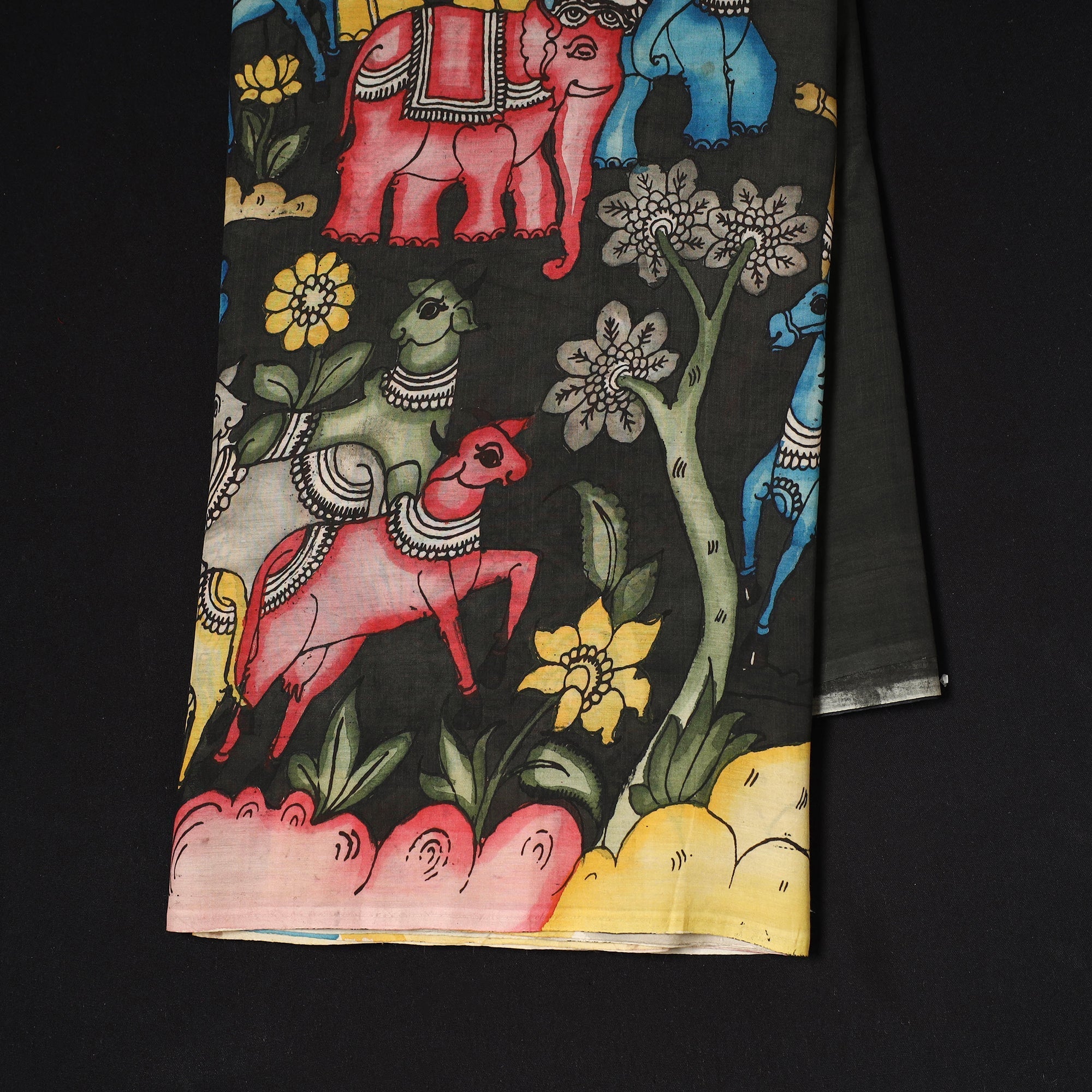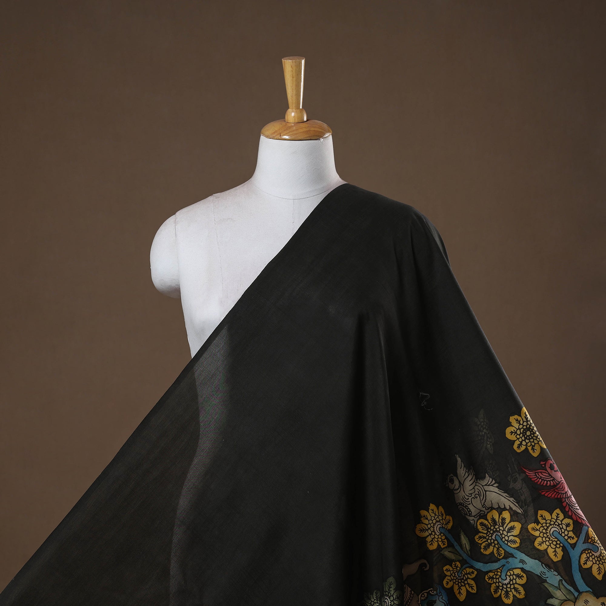 Black pen kalamkari fabric showcases the intricate srikalahasti style of pen work. Known for its gossamer texture and elegant feel, this fabric is made from a silk cotton blend. The Srikalahasti style involves freehand drawing with a kalam (pen) and filling it with rich hues a tradition practiced for over 200 years. Ideal for designing clothing, festive wear or unique decor accents.