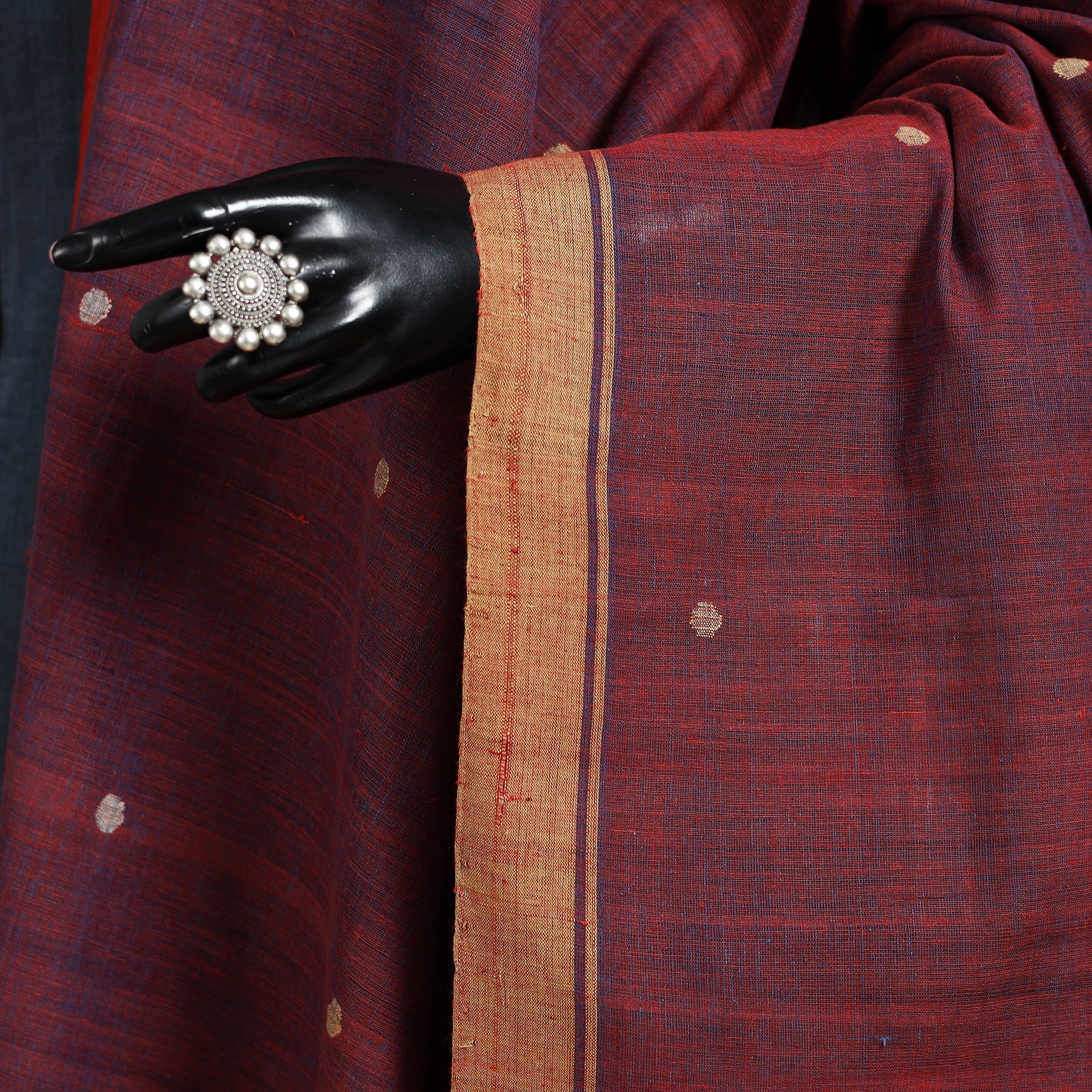Jamdani Srikakulam is very different from other Jamdani counterparts. Srikakulam, particularly Ponduru and its surrounding areas, is famous for its grayish-white hand-woven cotton fabric, often used to decorate simple butas fabrics woven in contrasting colors using the Jamdani technique.