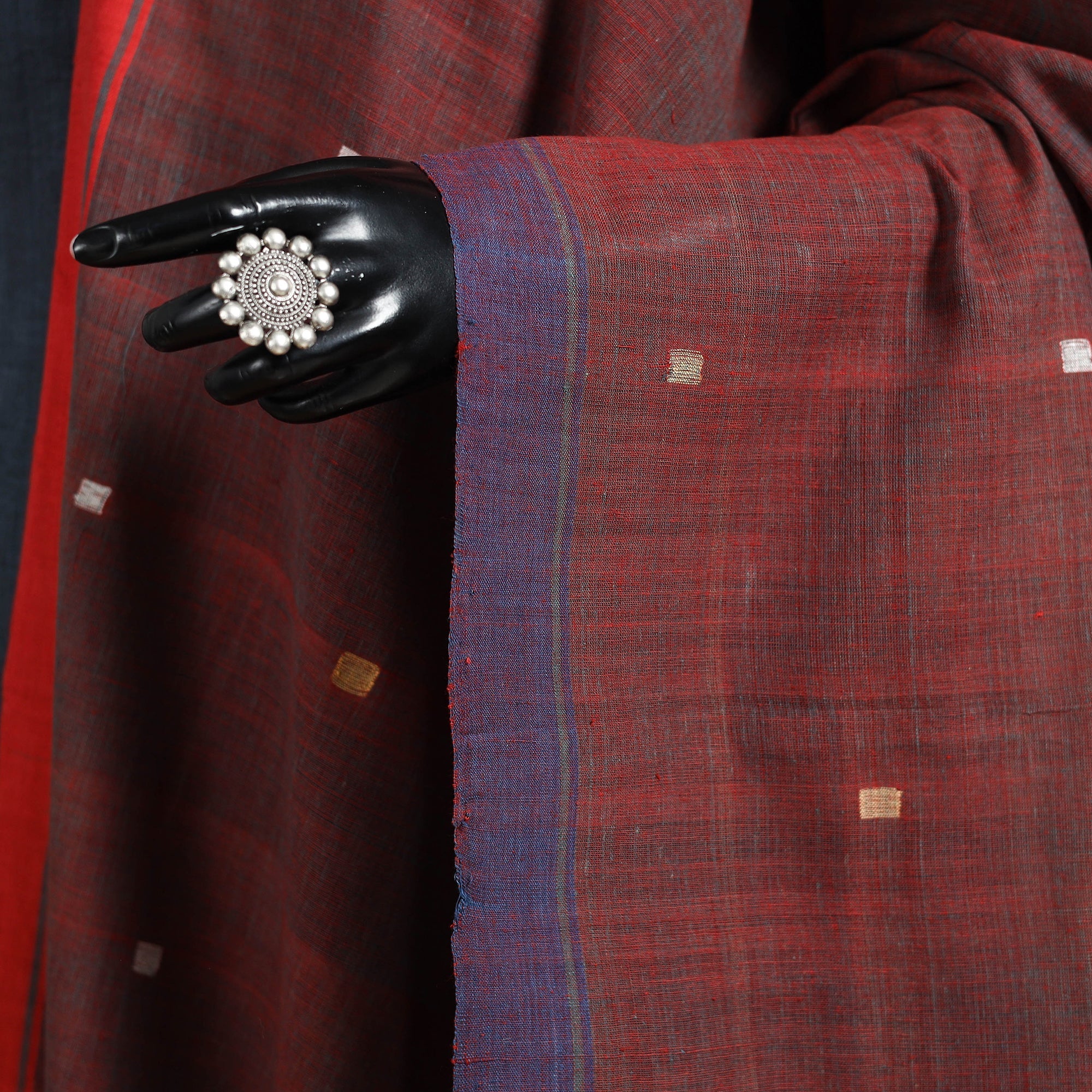 Jamdani Srikakulam is very different from other Jamdani counterparts. Srikakulam, particularly Ponduru and its surrounding areas, is famous for its grayish-white hand-woven cotton fabric, often used to decorate simple butas fabrics woven in contrasting colors using the Jamdani technique.
