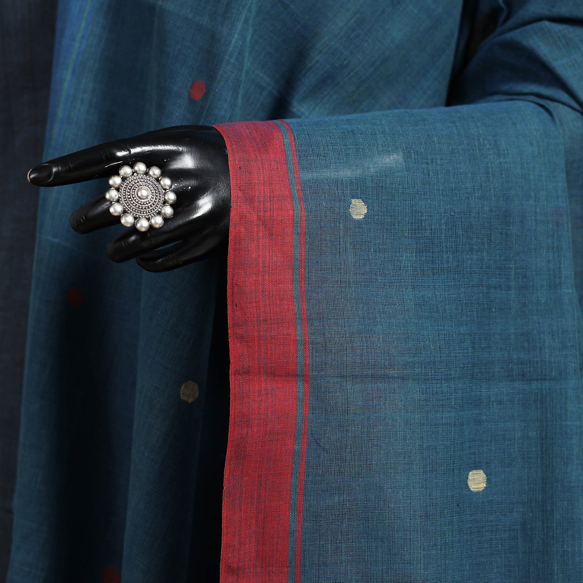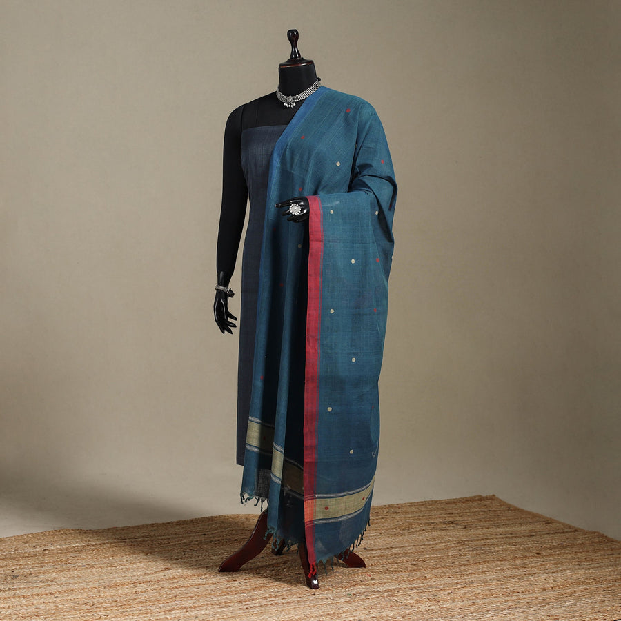 Experience the artistry of this blue handspun handloom buti natural dyed cotton jamdani dupatta from Srikakulam, Andhra Pradesh. Woven on traditional pit looms using the intricate supplementary weft technique, it features fine butis and soft natural hues. Lightweight and comfortable, it pairs beautifully with kurtas, or contemporary outfits, adding a graceful touch to festive, casual, or office wear.
