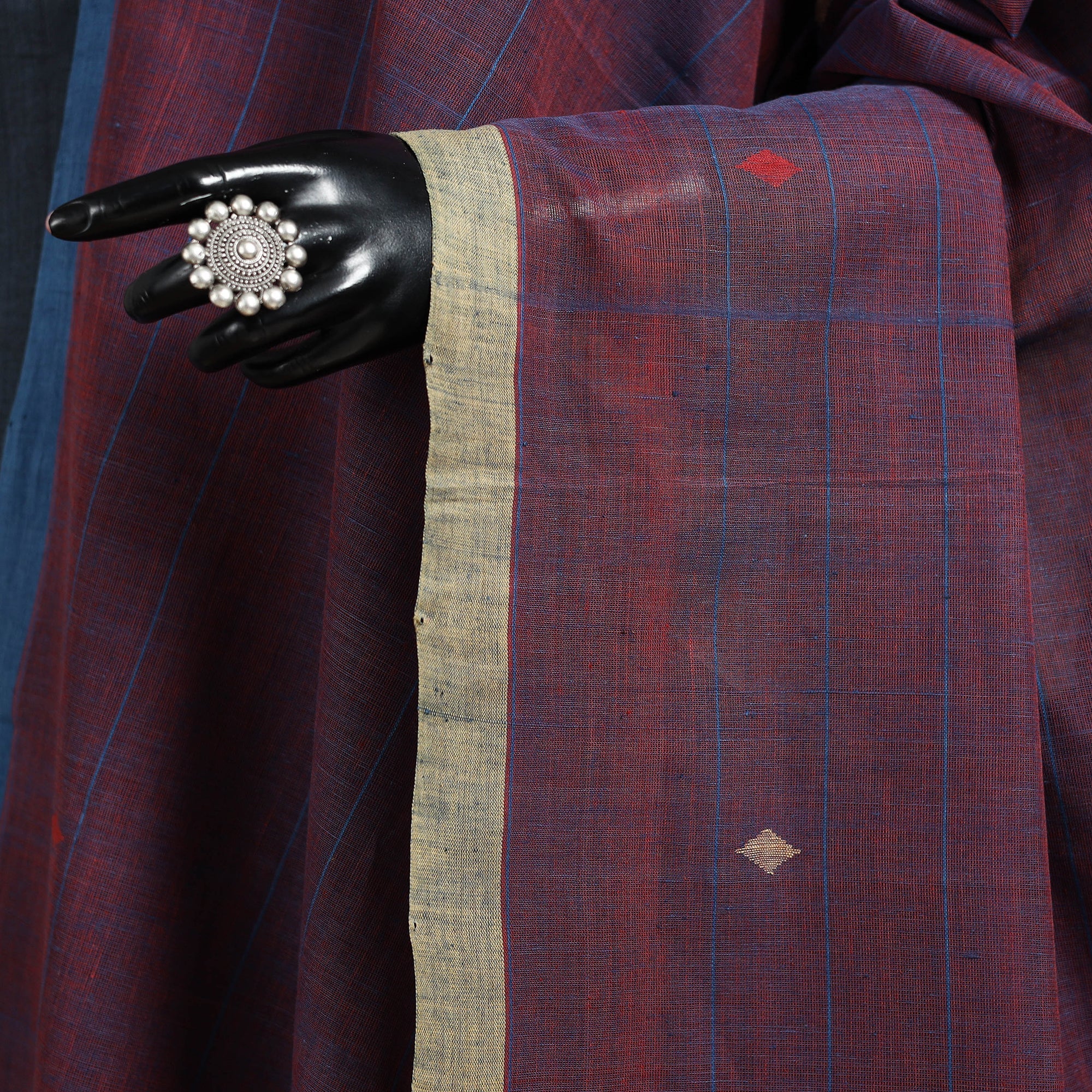 Jamdani Srikakulam is very different from other Jamdani counterparts. Srikakulam, particularly Ponduru and its surrounding areas, is famous for its grayish-white hand-woven cotton fabric, often used to decorate simple butas fabrics woven in contrasting colors using the Jamdani technique.