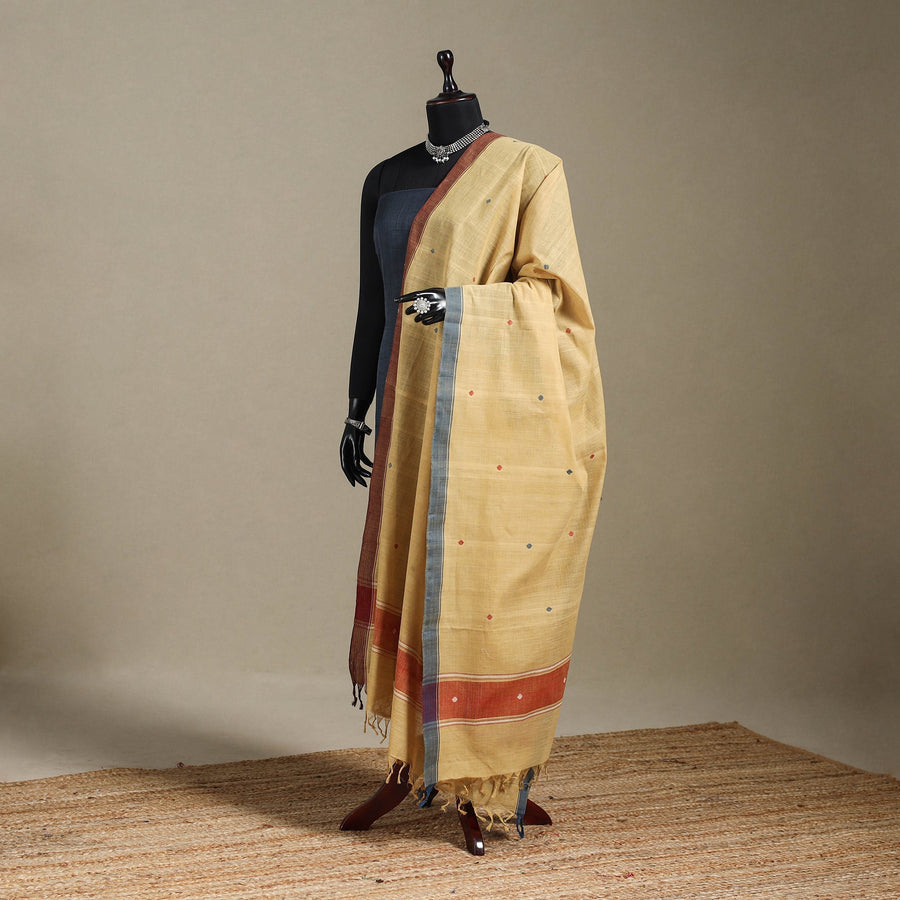 Experience the artistry of this beige handspun handloom buti natural dyed cotton jamdani dupatta from Srikakulam, Andhra Pradesh. Woven on traditional pit looms using the intricate supplementary weft technique, it features fine butis and soft natural hues. Lightweight and comfortable, it pairs beautifully with kurtas, or contemporary outfits, adding a graceful touch to festive, casual, or office wear.
