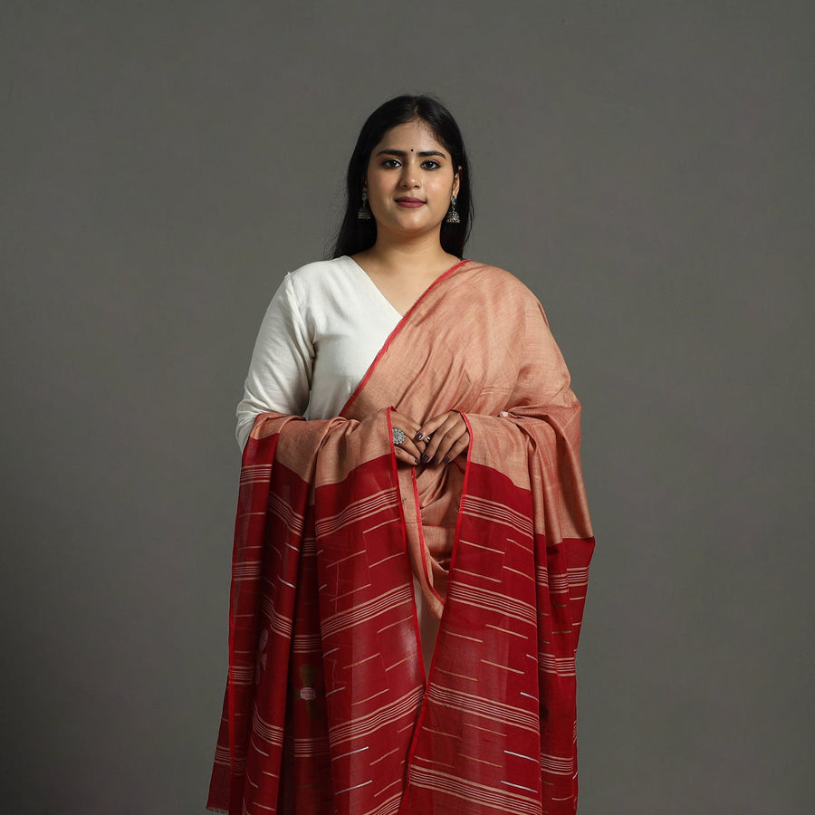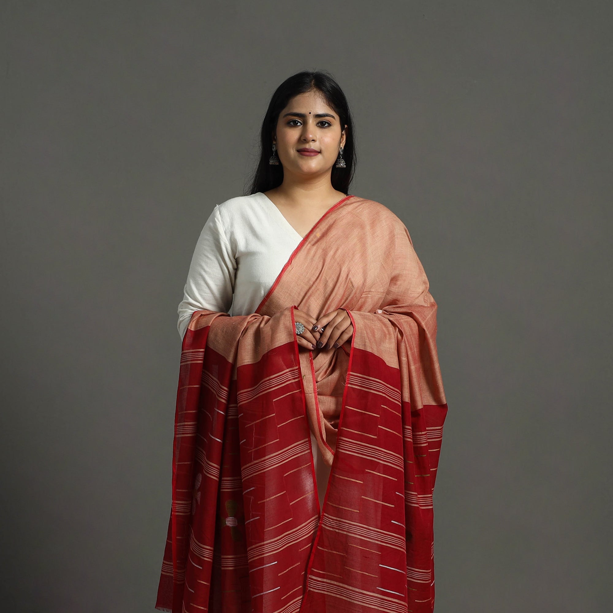 Handspun handloom cotton jamdani dupatta with tassels from West Bengal. Jamdani (extra weft) weaving, a style unique to Bengal…literally like “hand embroidery” on the loom. The method of weaving resembles tapestry work in which small shuttles of coloured, gold or silver threads, are passed through the warp. Jamdani, because of its intricate patterns, has always been a highly expensive product. The process is extremely time consuming as it involves a tedious form of hand looming.