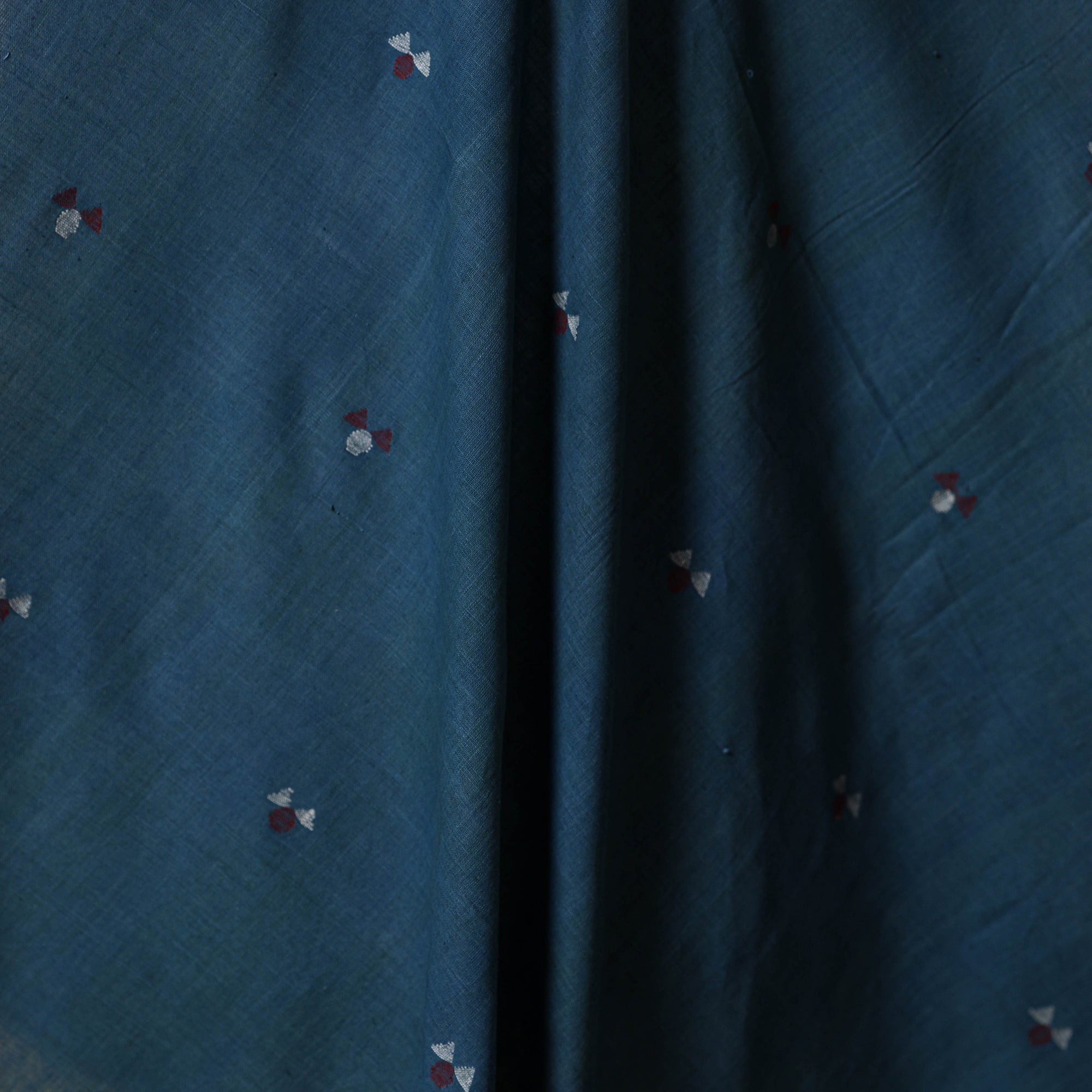 Blue handspun handloom cotton jamdani fabric from the Srikakulam district of Andhra Pradesh. Woven on traditional pit looms using the intricate extra weft technique, it features fine butis and natural hues. This fabric is suitable for making sarees, dupattas, kurtas, or home decor items.