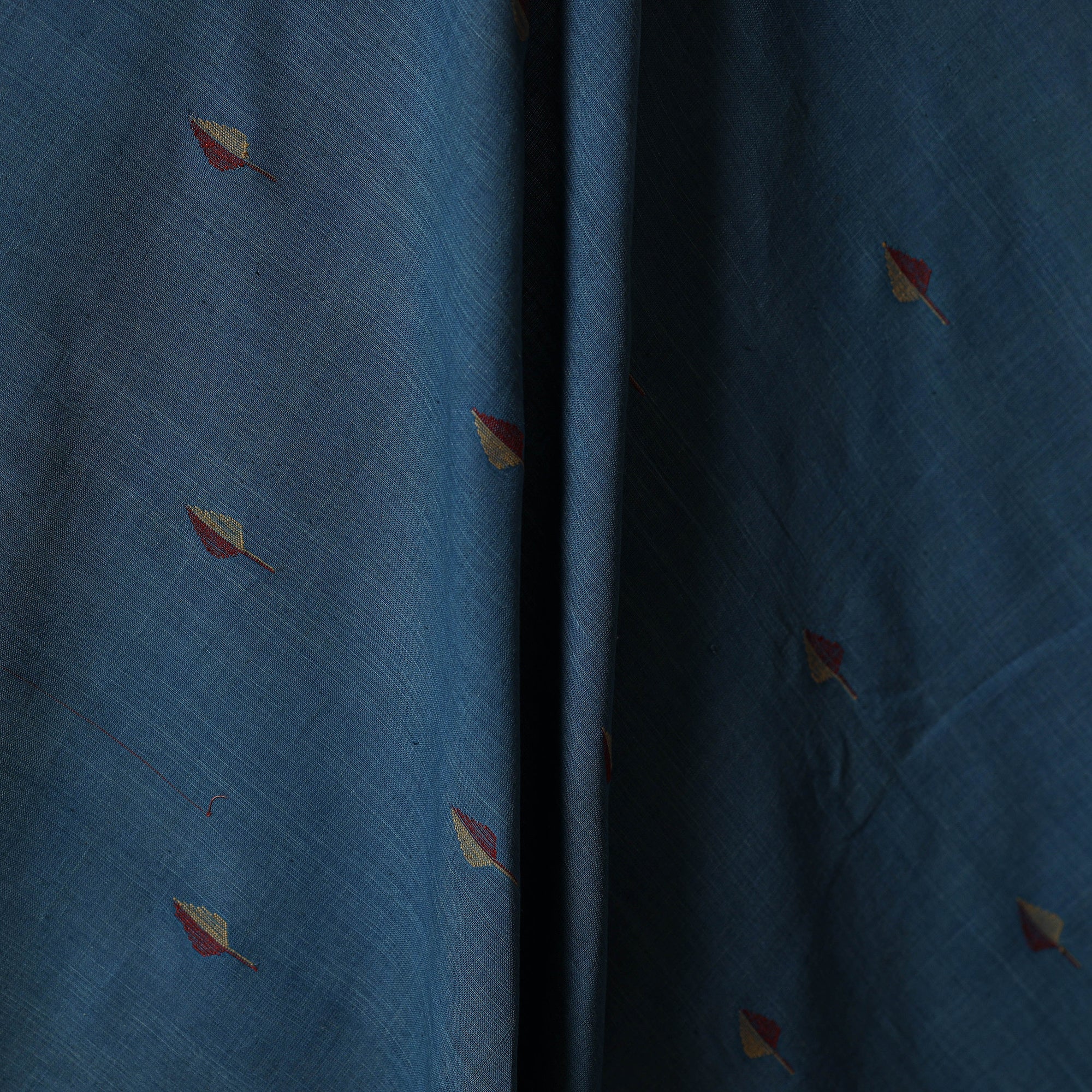 Blue handspun handloom cotton jamdani fabric from the Srikakulam district of Andhra Pradesh. Woven on traditional pit looms using the intricate extra weft technique, it features fine butis and natural hues. This fabric is suitable for making sarees, dupattas, kurtas, or home decor items.