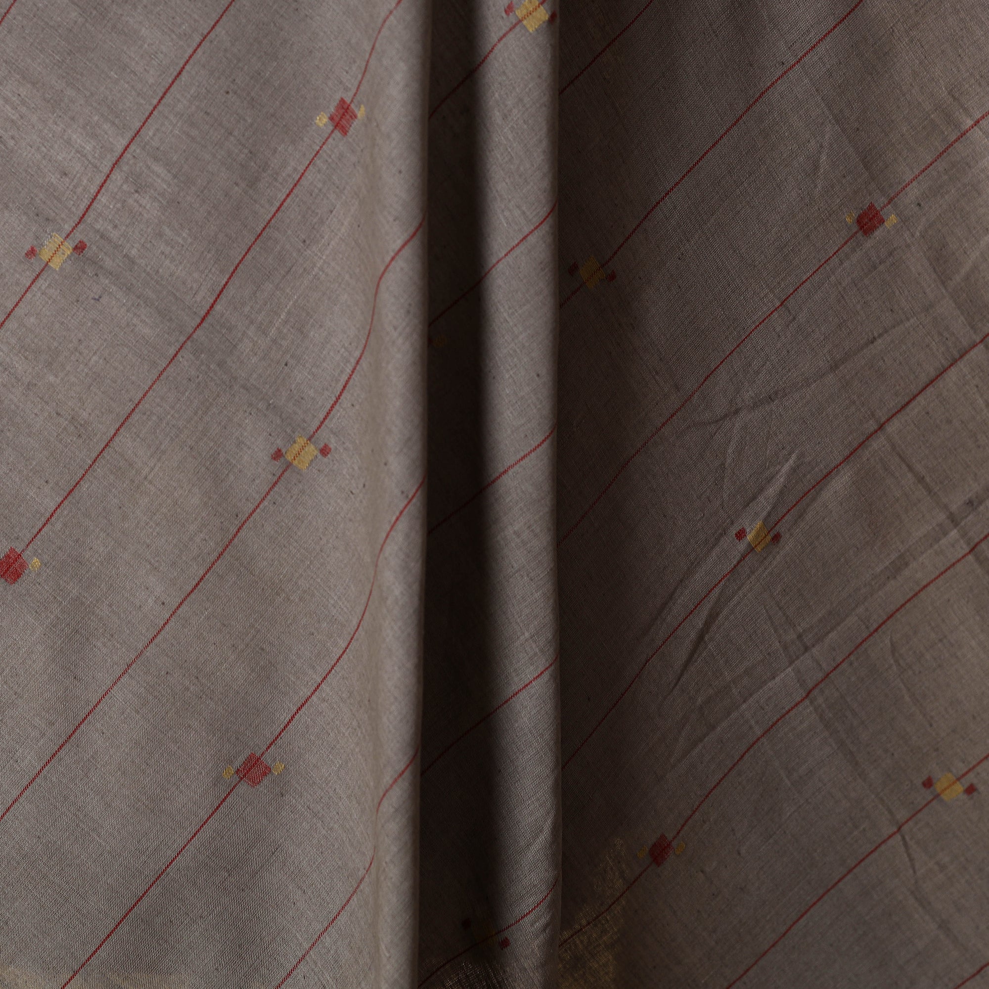 Grey handspun handloom cotton jamdani fabric from the Srikakulam district of Andhra Pradesh. Woven on traditional pit looms using the intricate extra weft technique, it features fine butis and natural hues. This fabric is suitable for making sarees, dupattas, kurtas, or home decor items.