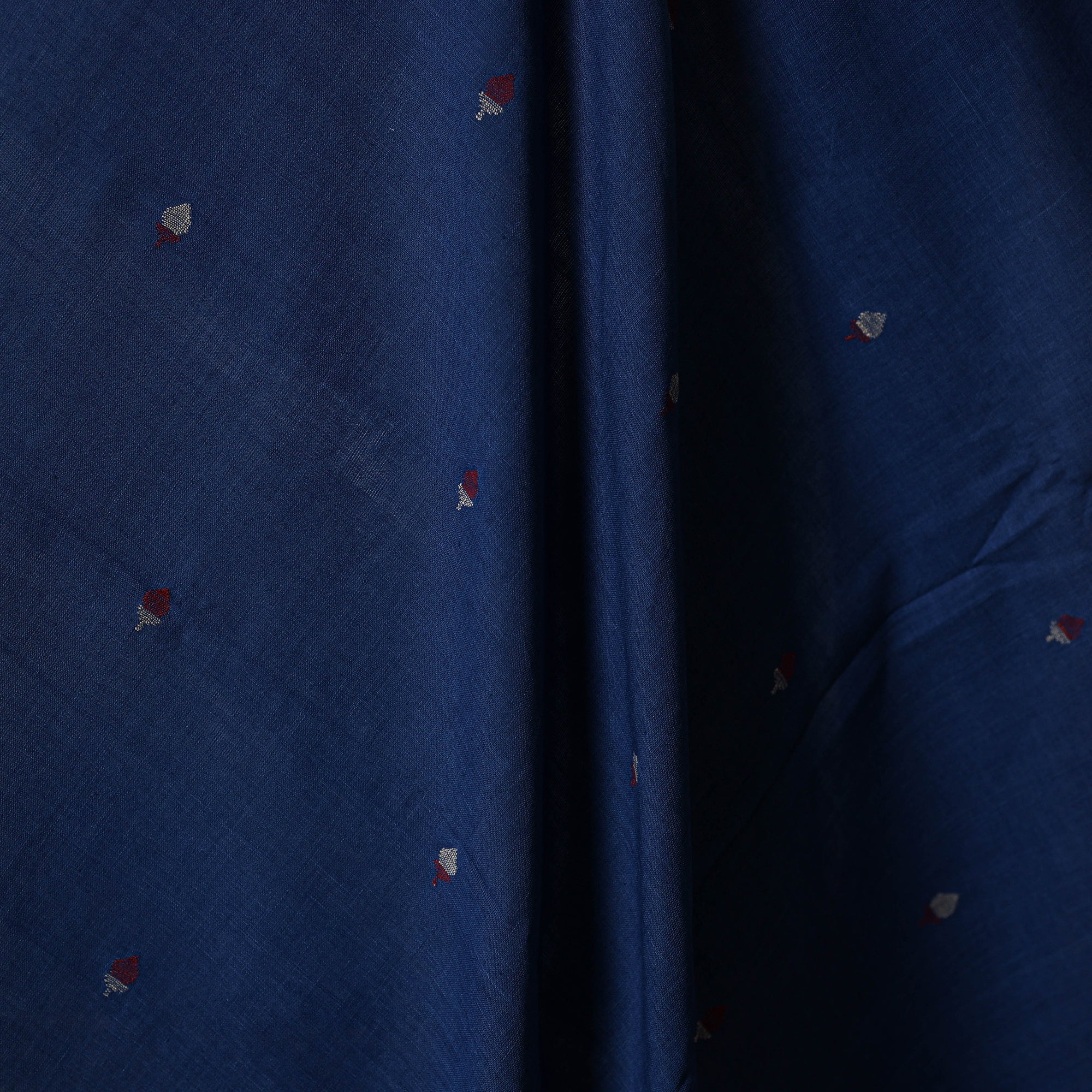 Blue handspun handloom cotton jamdani fabric from the Srikakulam district of Andhra Pradesh. Woven on traditional pit looms using the intricate extra weft technique, it features fine butis and natural hues. This fabric is suitable for making sarees, dupattas, kurtas, or home decor items.