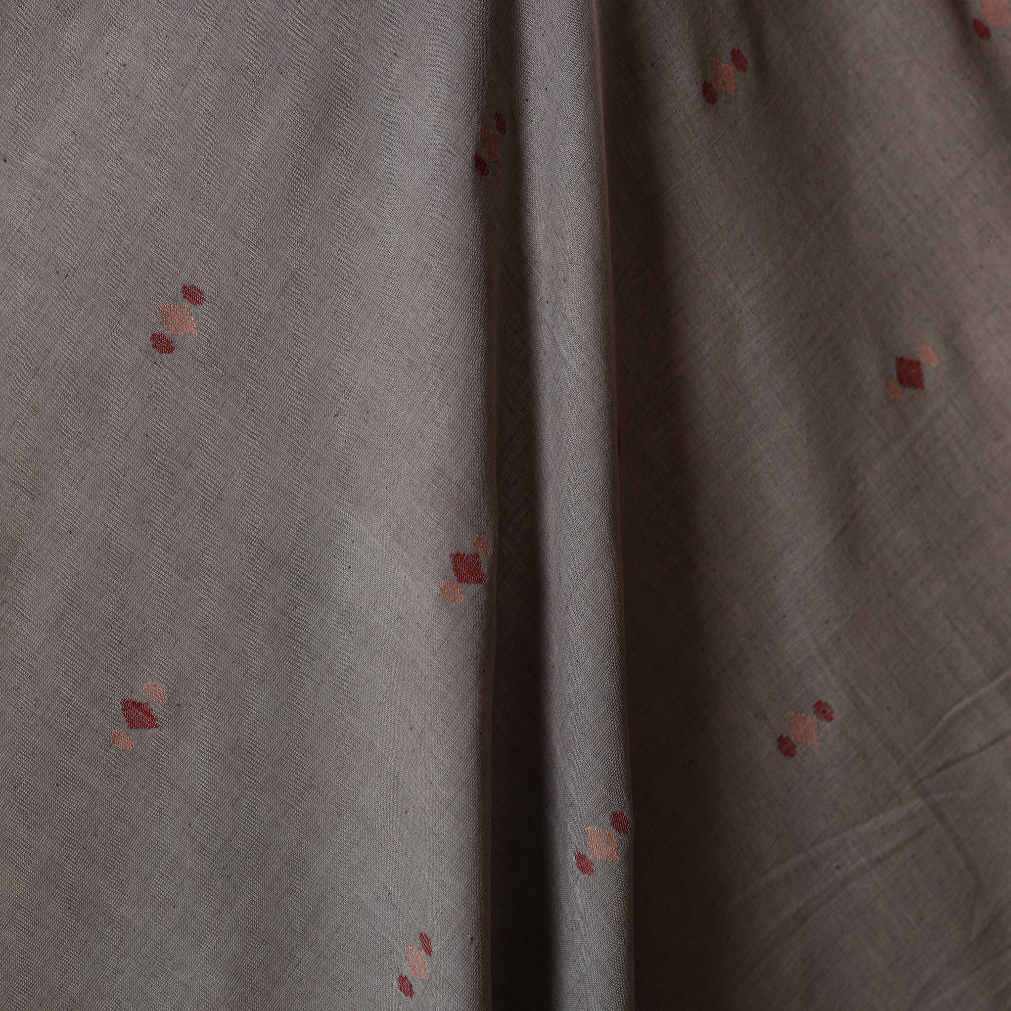Grey handspun handloom cotton jamdani fabric from the Srikakulam district of Andhra Pradesh. Woven on traditional pit looms using the intricate extra weft technique, it features fine butis and natural hues. This fabric is suitable for making sarees, dupattas, kurtas, or home decor items.
