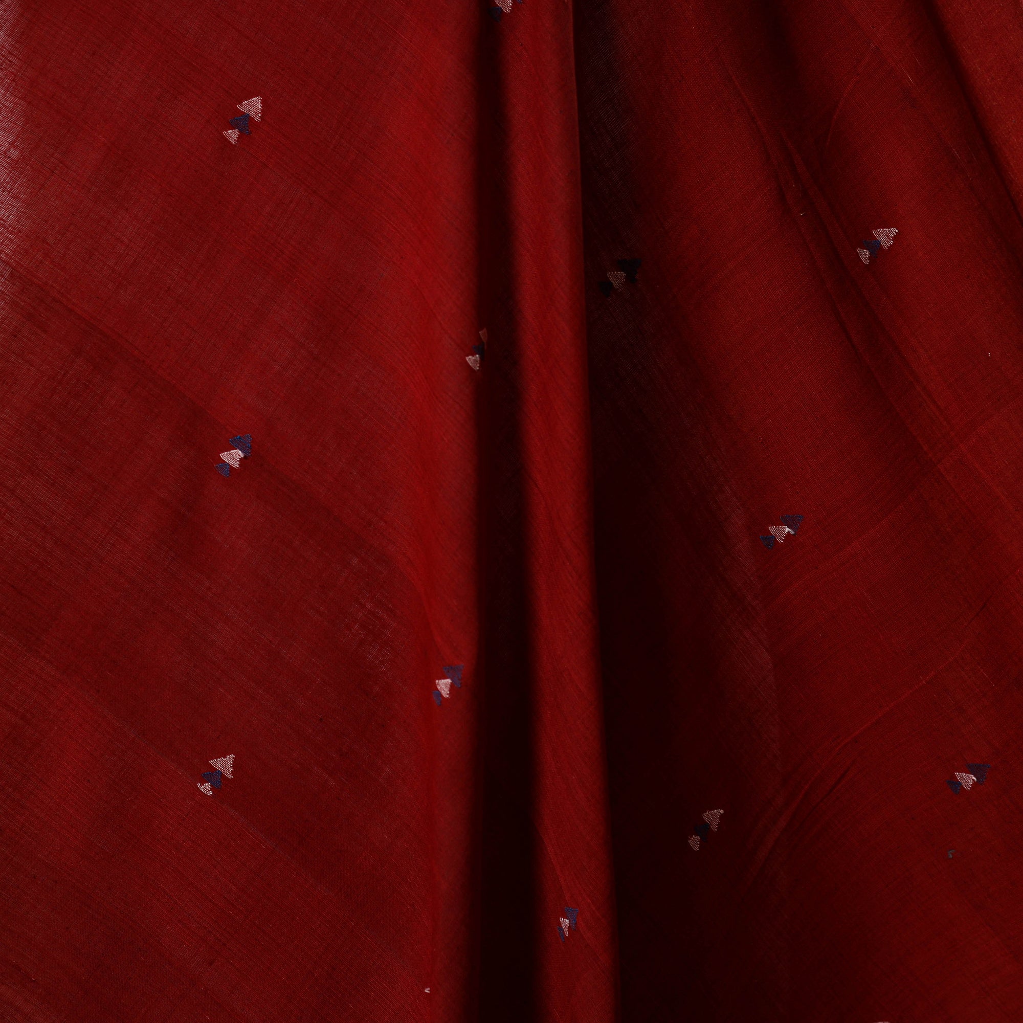 Maroon handspun handloom cotton jamdani fabric from the Srikakulam district of Andhra Pradesh. Woven on traditional pit looms using the intricate extra weft technique, it features fine butis and natural hues. This fabric is suitable for making sarees, dupattas, kurtas, or home decor items.