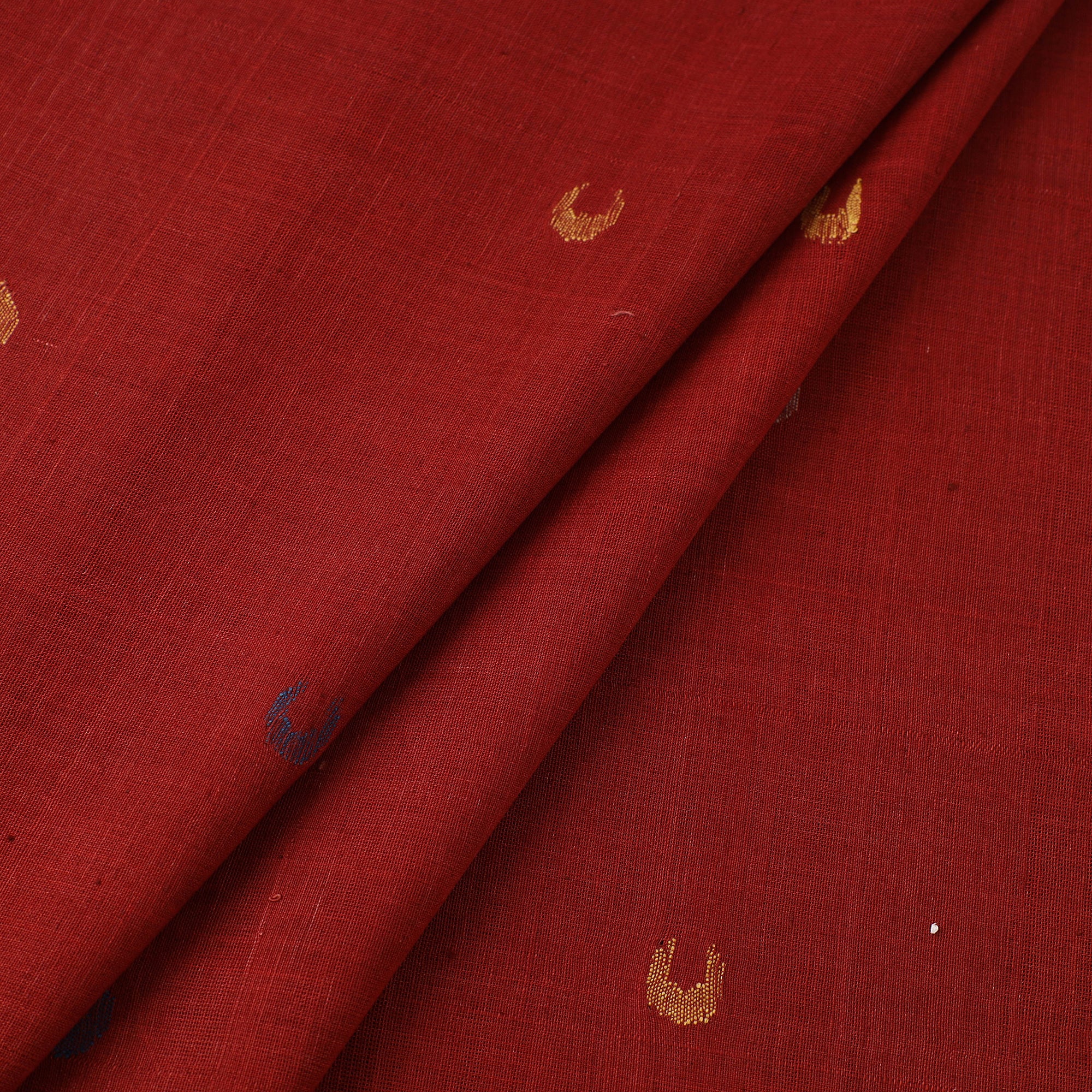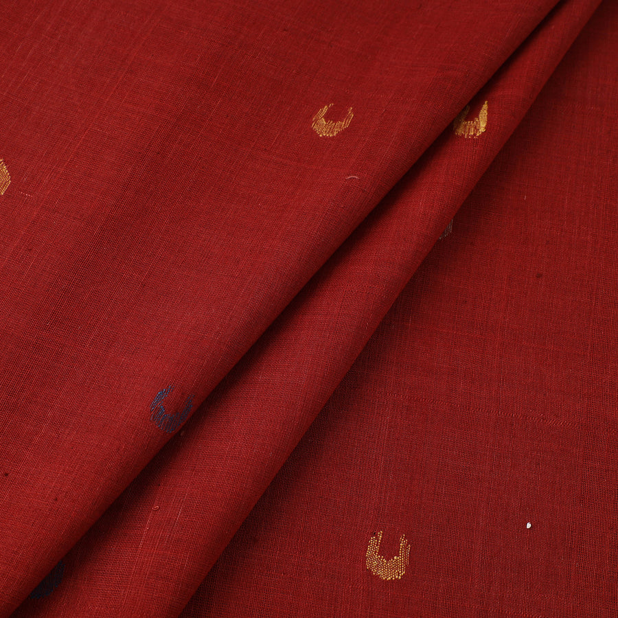 Experience the artistry of red handspun handloom natural dyed cotton jamdani fabric from the Srikakulam district of Andhra Pradesh. Crafted using a handloom pit loom technique, this fabric is woven with precision, ensuring durability and finesse. The making of Jamdani involves the supplementary weft technique, a meticulous and time-consuming process requiring expert craftsmanship. This exquisite fabric is perfect for sarees, dupattas, kurtas, or elegant home decor, adding a touch of tradition to every creation.