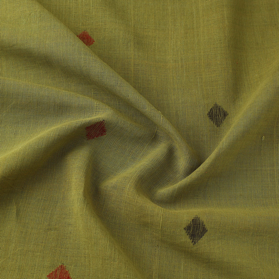 Experience the artistry of green handspun handloom natural dyed cotton jamdani fabric from the Srikakulam district of Andhra Pradesh. Crafted using a handloom pit loom technique, this fabric is woven with precision, ensuring durability and finesse. The making of Jamdani involves the supplementary weft technique, a meticulous and time-consuming process requiring expert craftsmanship. This exquisite fabric is perfect for sarees, dupattas, kurtas, or elegant home decor, adding a touch of tradition to every creation.