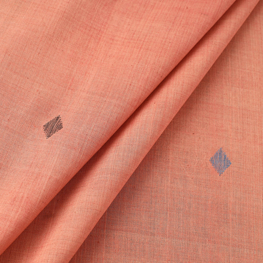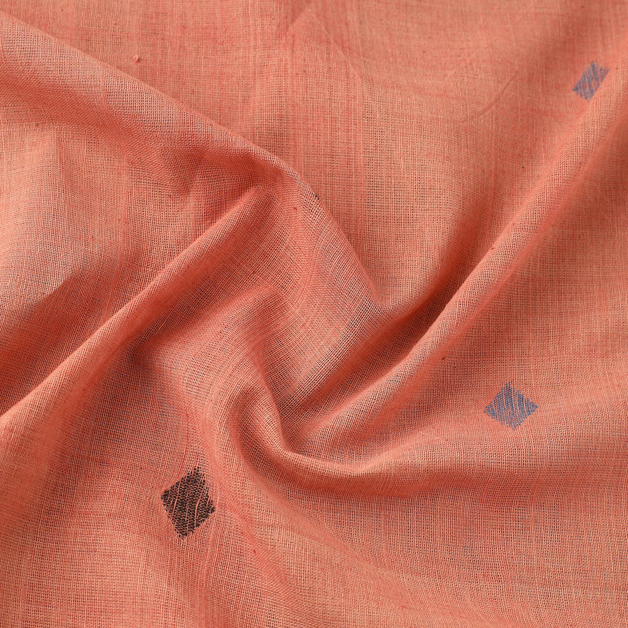 Experience the artistry of peach handspun handloom natural dyed cotton jamdani fabric from the Srikakulam district of Andhra Pradesh. Crafted using a handloom pit loom technique, this fabric is woven with precision, ensuring durability and finesse. The making of Jamdani involves the supplementary weft technique, a meticulous and time-consuming process requiring expert craftsmanship. This exquisite fabric is perfect for sarees, dupattas, kurtas, or elegant home decor, adding a touch of tradition to every creation.