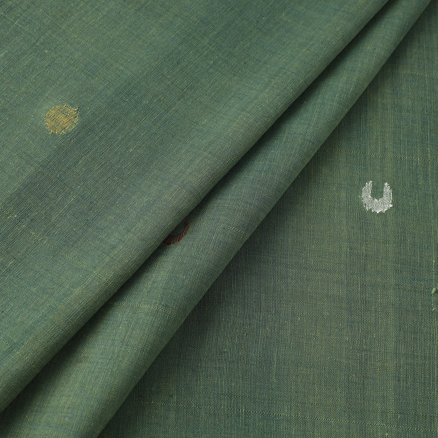 Experience the artistry of green handspun handloom natural dyed cotton jamdani fabric from the Srikakulam district of Andhra Pradesh. Crafted using a handloom pit loom technique, this fabric is woven with precision, ensuring durability and finesse. The making of Jamdani involves the supplementary weft technique, a meticulous and time-consuming process requiring expert craftsmanship. This exquisite fabric is perfect for sarees, dupattas, kurtas, or elegant home decor, adding a touch of tradition to every creation.