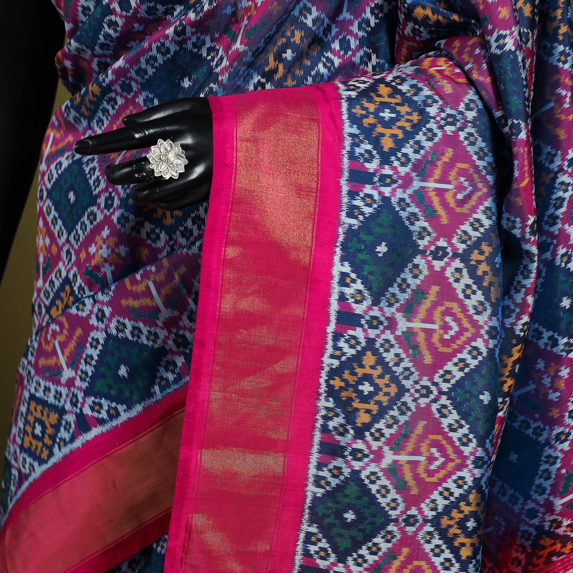 This exquisite blue handspun handloom silk pochampally patola ikat saree with zari border from Telangana showcases the legendary artistry of Padmashree Gajam Govardhana. Crafted using the traditional resist dyeing technique, it beautifully combines the geometric precision of Pochampally Ikat with timeless elegance. Woven in fine filature silk, the saree features intricate patterns and a lustrous zari border that adds a regal charm. Perfect for weddings, festive celebrations, and elegant gatherings, it is a true collectible for connoisseurs of Indian textiles.