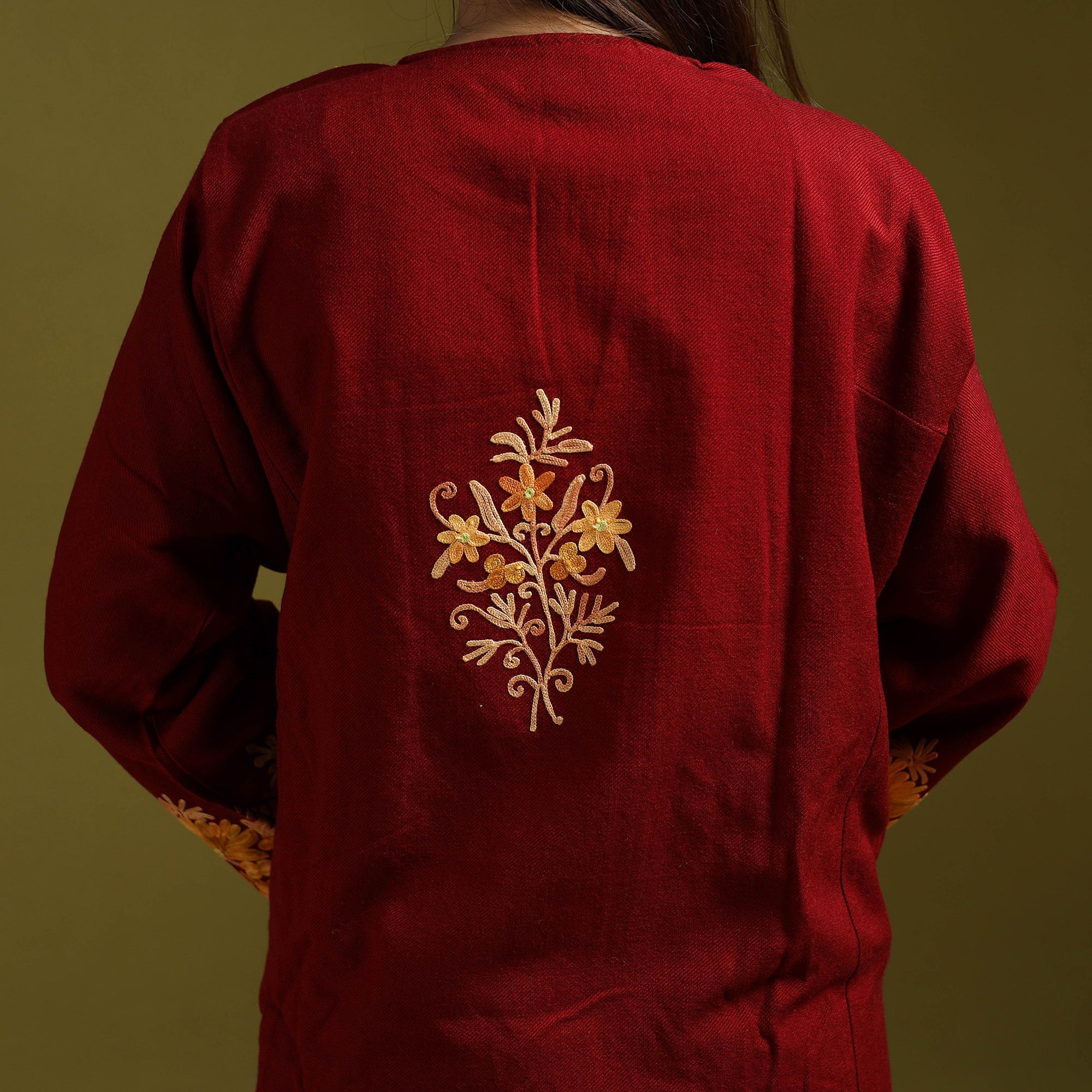 This maroon handwoven pheran is crafted from soft merino wool and adorned with fine aari embroidery, carefully made by skilled artisans of Nakeeb, reflecting Kashmir’s rich textile heritage. The pheran features two side pockets for everyday comfort. Perfect for winter days as well as special occasions.