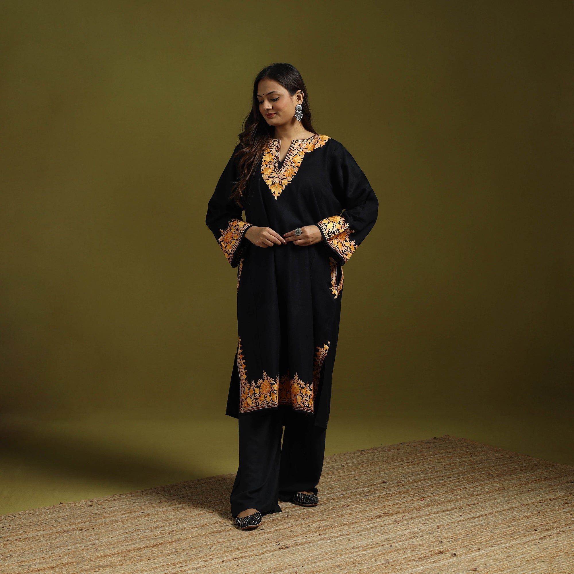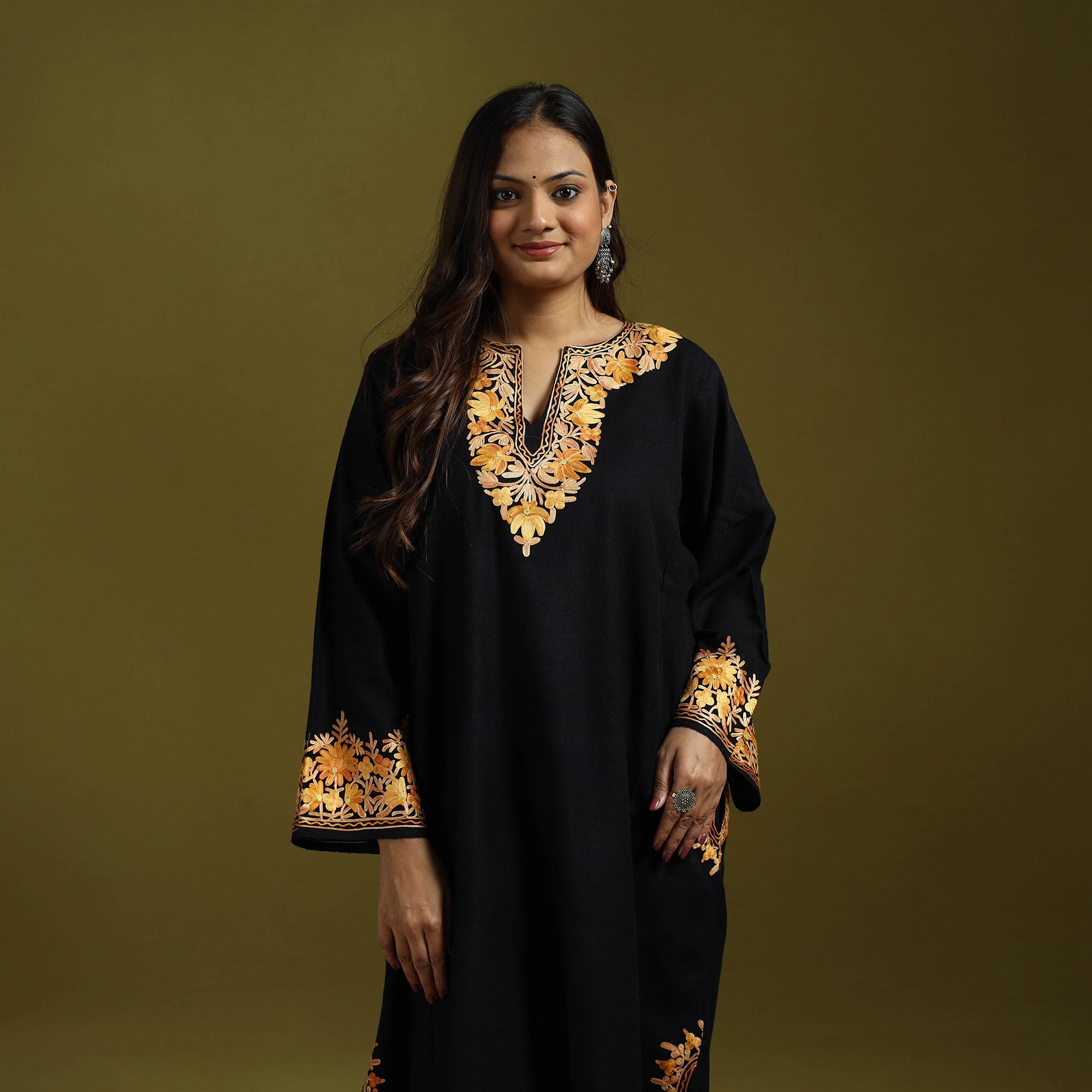 Black - Handwoven Aari Embroidered Kashmiri Merino Wool Pheran 19