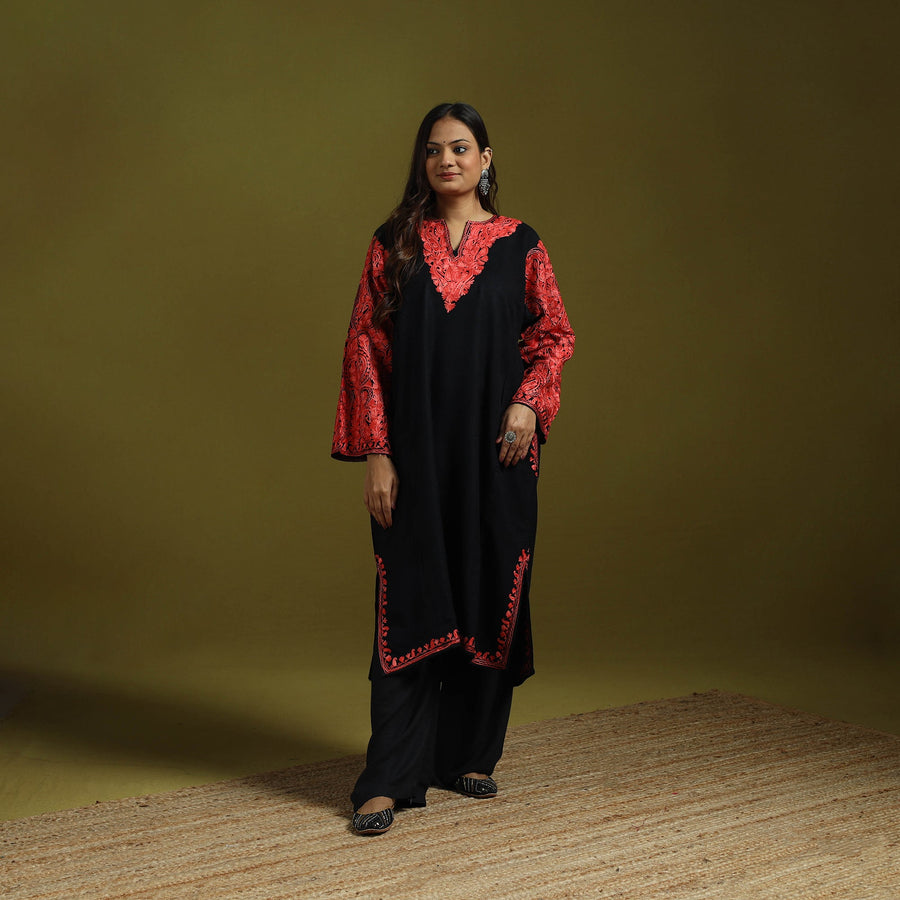 | Material | This black handwoven pheran is crafted from soft merino wool and adorned with fine aari embroidery, carefully made by skilled artisans of Nakeeb, reflecting Kashmir’s rich textile heritage. The pheran features two side pockets for everyday comfort. Perfect for winter days as well as special occasions. |