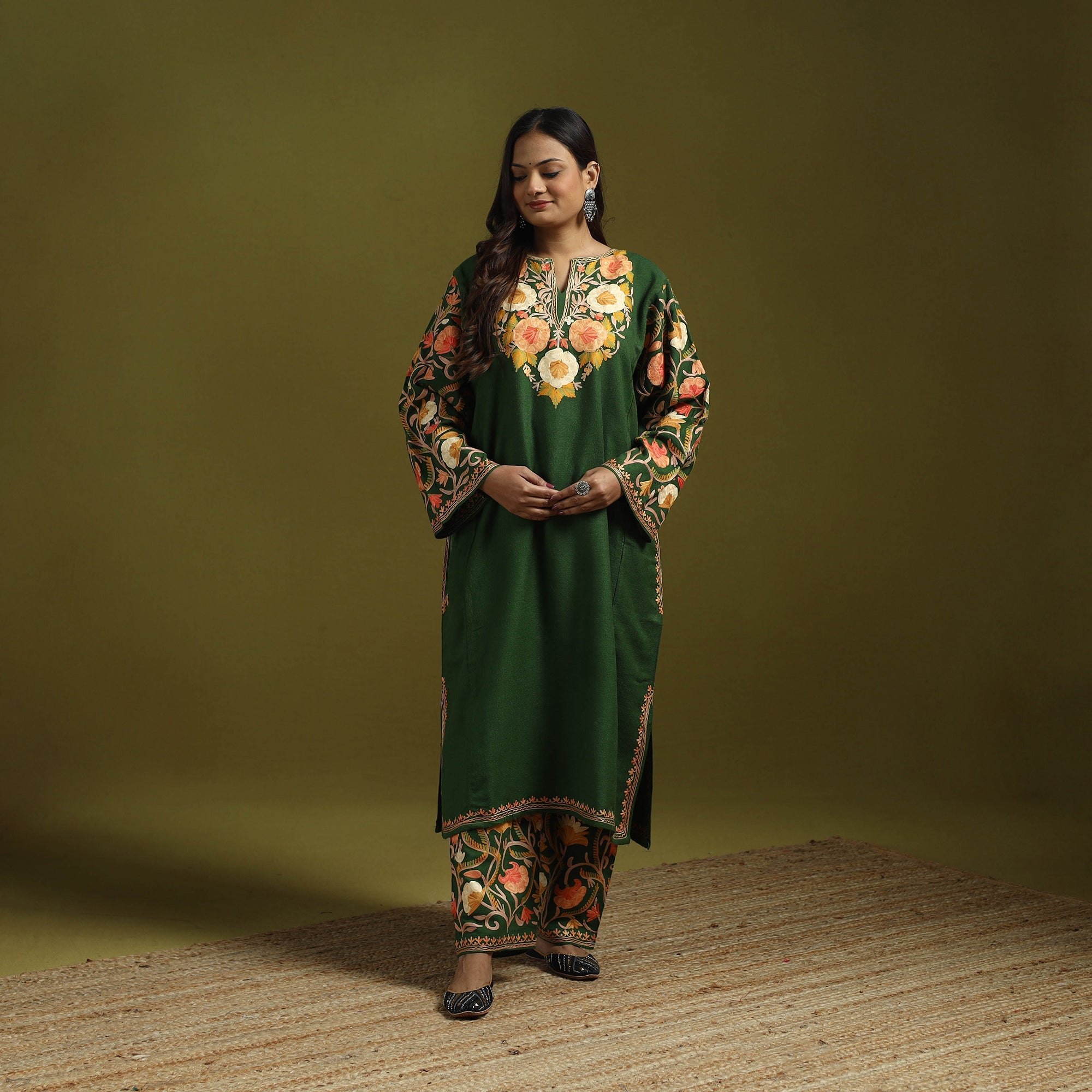This green handwoven pheran set is crafted from soft merino wool and adorned with fine Aari embroidery, carefully made by skilled artisans of Nakeeb, reflecting Kashmir’s rich textile heritage. The Pheran features two side pockets for everyday comfort and is paired with an elasticated palazzo for an easy, relaxed fit. Perfect for winter days as well as special occasions.