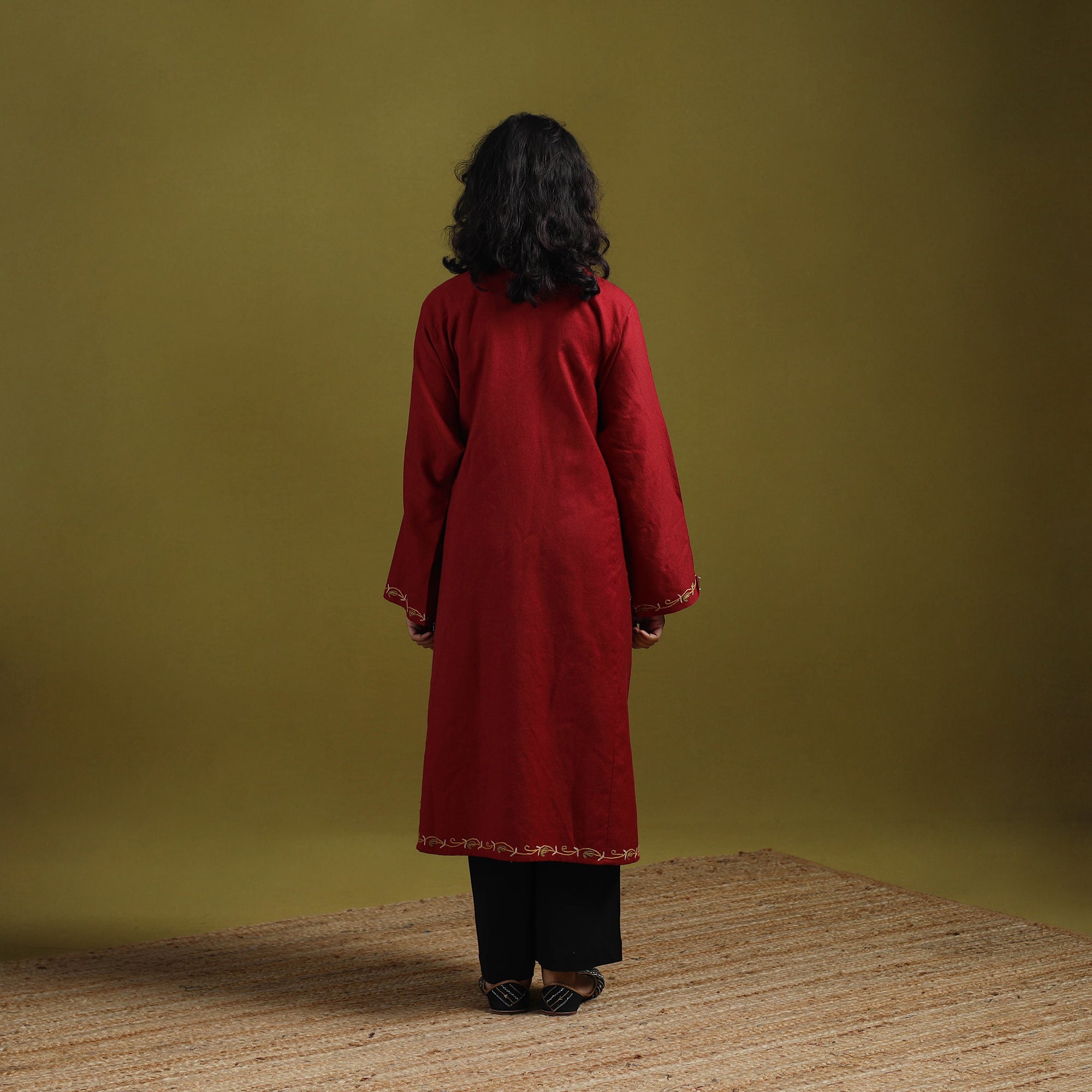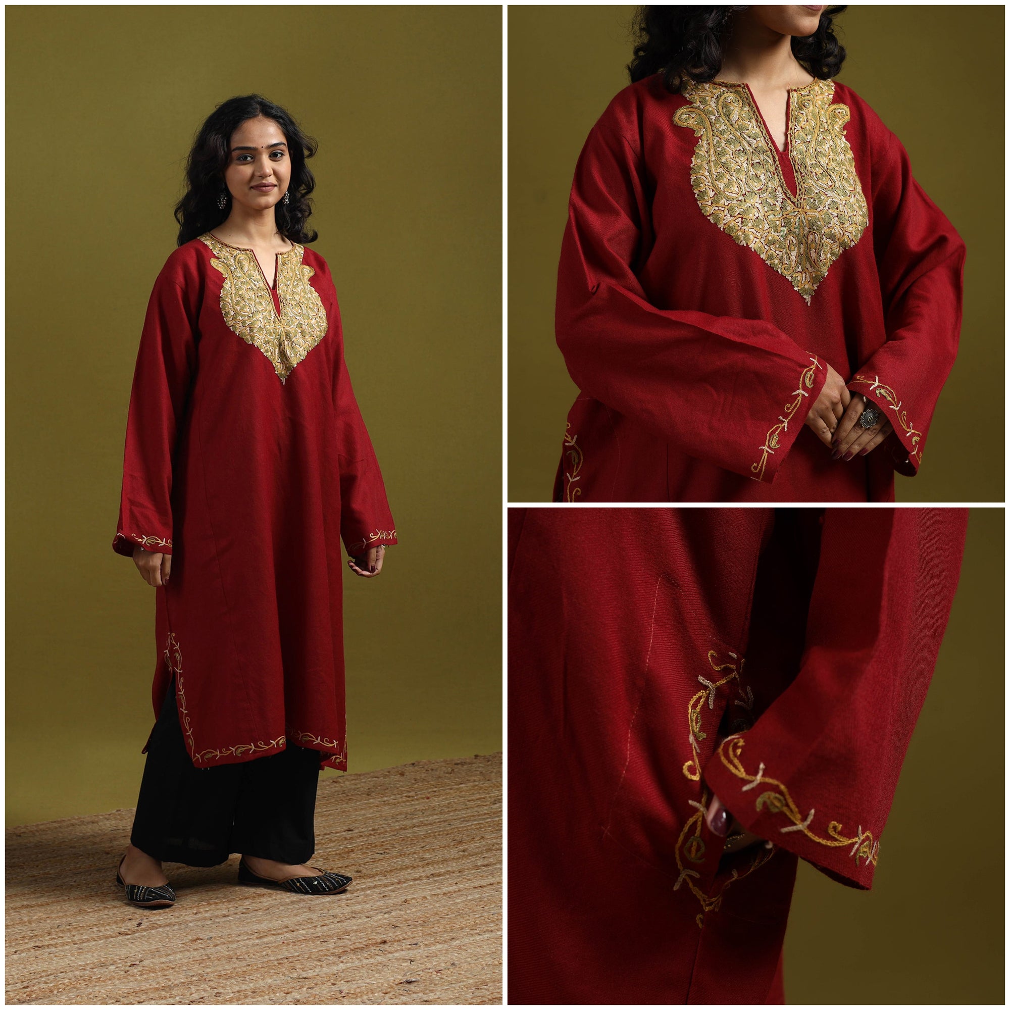 | Material | Red handwoven pheran is crafted from soft merino wool and adorned with fine aari hand embroidery, carefully made by skilled artisans of Nakeeb, reflecting Kashmir’s rich textile heritage. The pheran features two side pockets for everyday comfort. Perfect for winter days as well as special occasions. |