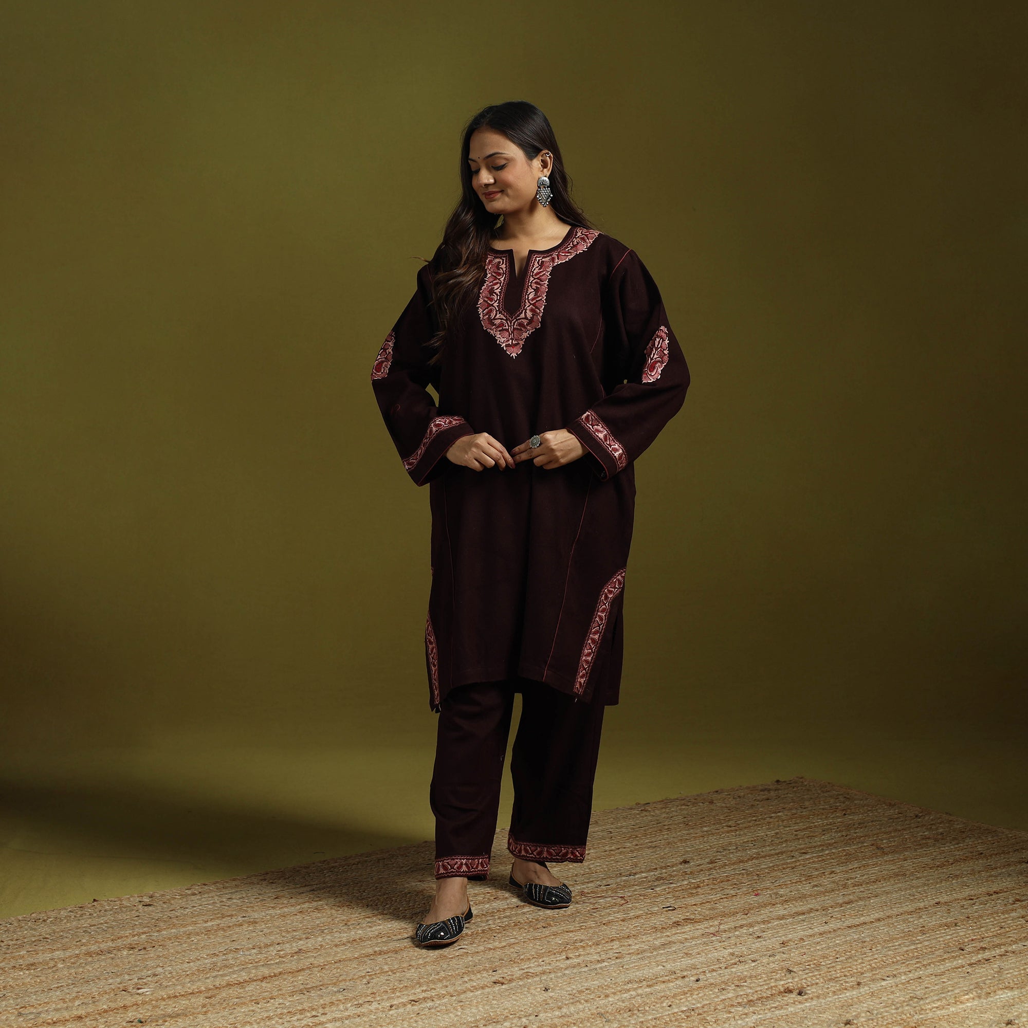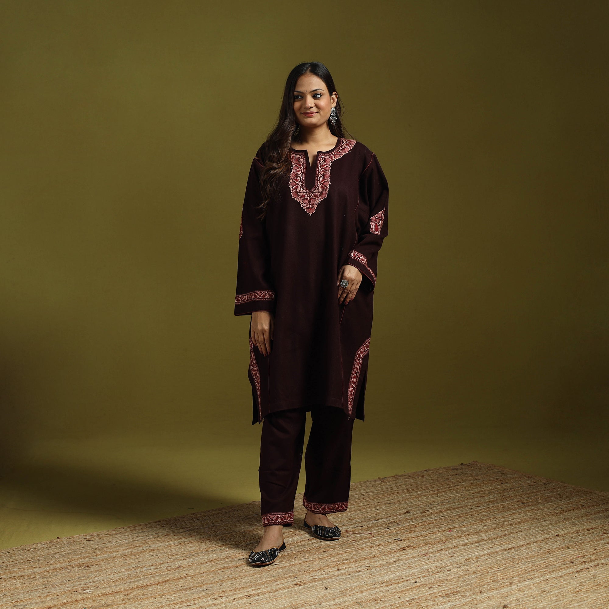 This maroon handwoven pheran set is crafted from soft merino wool and adorned with fine aari hand embroidery, carefully made by skilled artisans of Nakeeb, reflecting Kashmir’s rich textile heritage. The pheran features two side pockets for everyday comfort and is paired with an elasticated palazzo for an easy, relaxed fit. Perfect for winter days as well as special occasions.