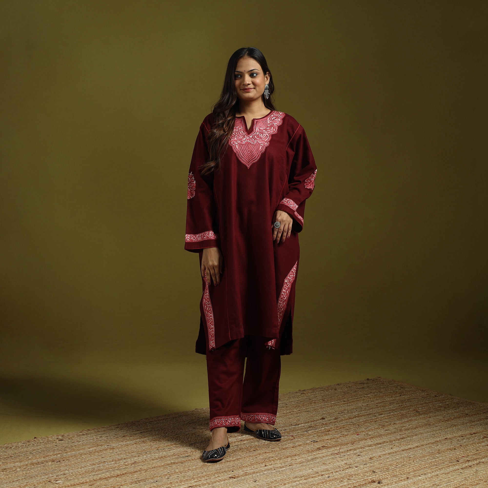 This maroonhandwoven pheran set is crafted from soft merino wool and adorned with fine aari hand embroidery, carefully made by skilled artisans of Nakeeb, reflecting Kashmir’s rich textile heritage. The pheran features two side pockets for everyday comfort and is paired with an elasticated palazzo for an easy, relaxed fit. Perfect for winter days as well as special occasions.