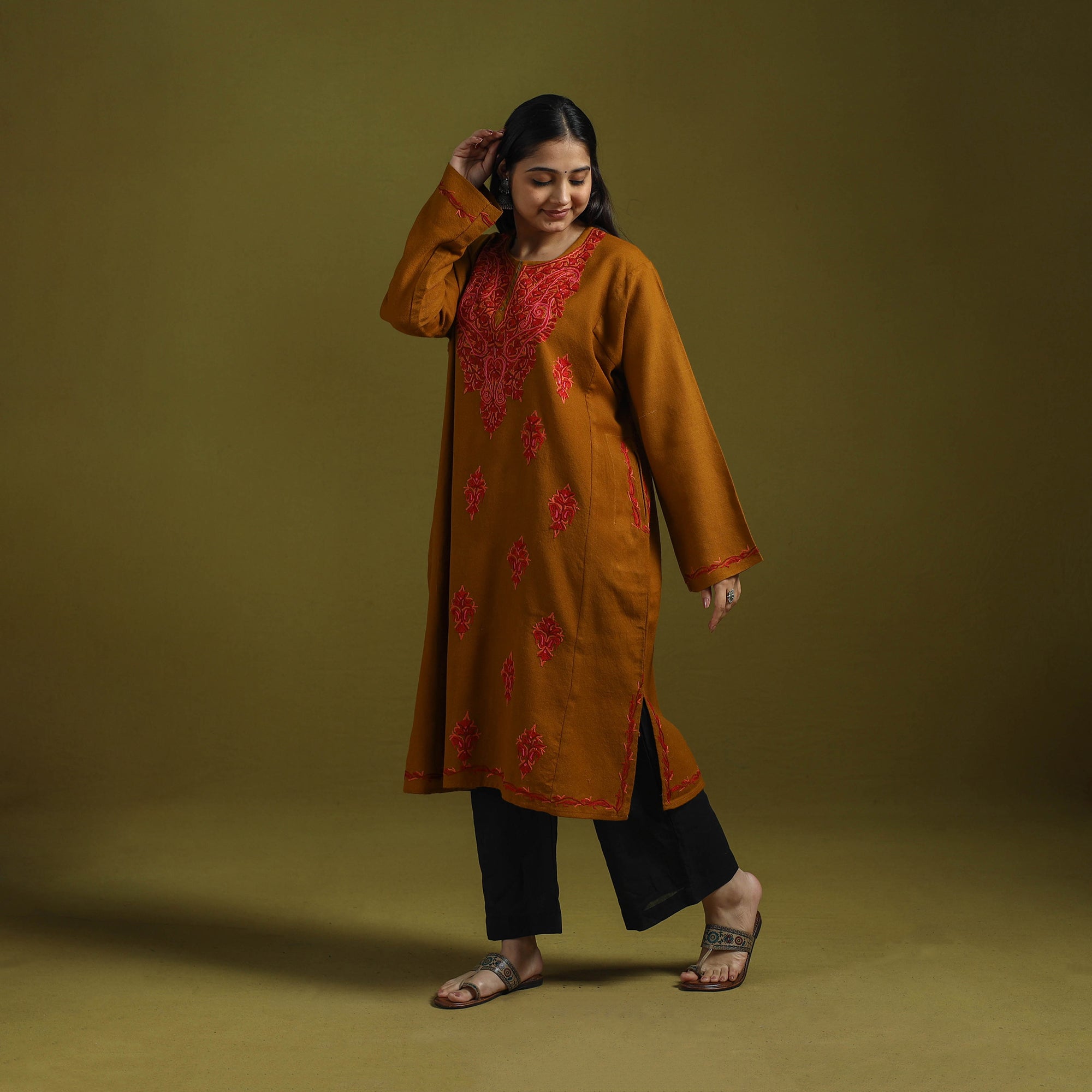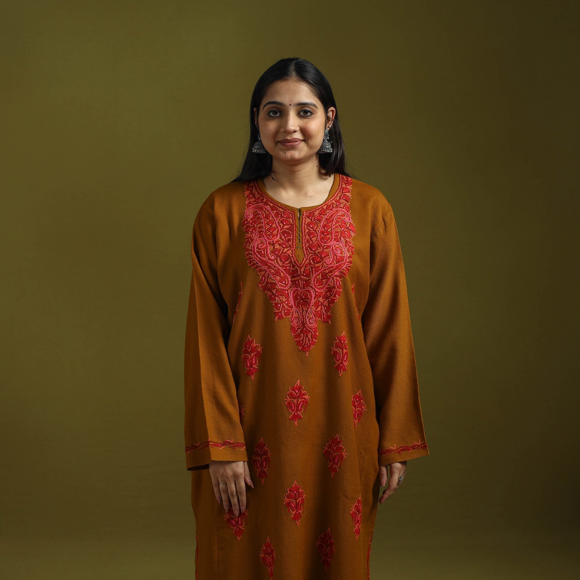Maroon - Handwoven Aari Hand Embroidered Kashmiri Merino Wool Pheran with Palazzo Set 46