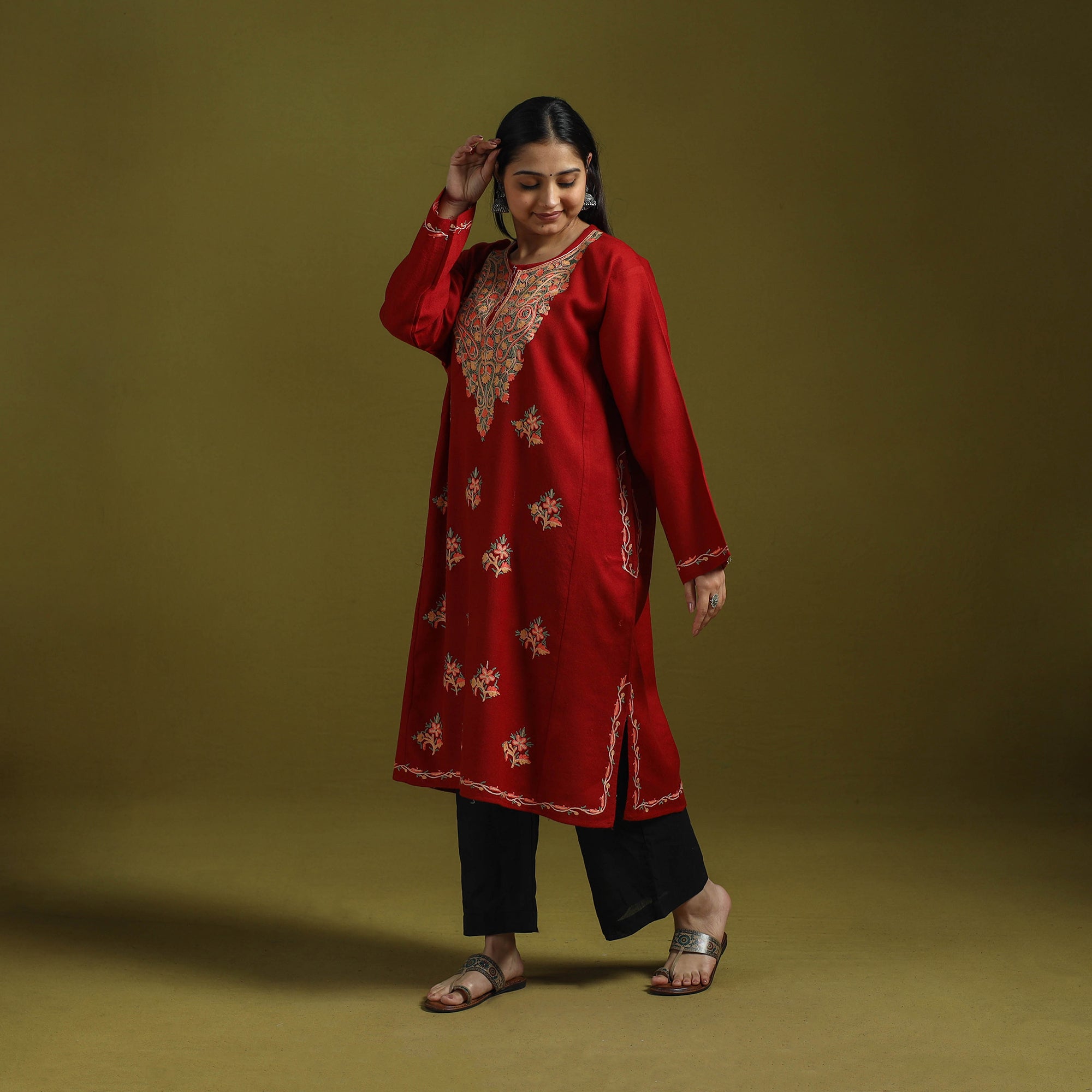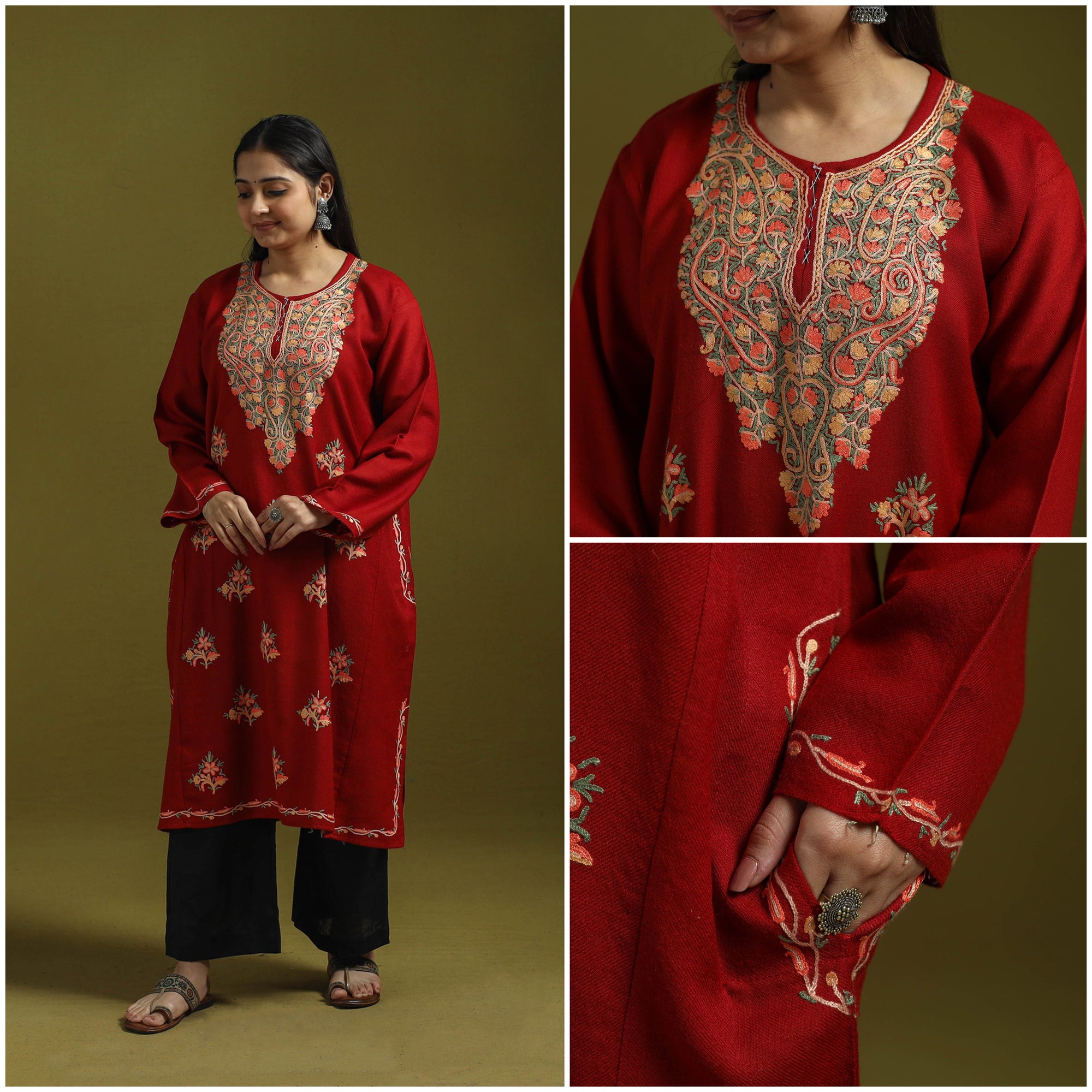 Maroon - Handwoven Aari Hand Embroidered Kashmiri Merino Wool Pheran with Palazzo Set 46