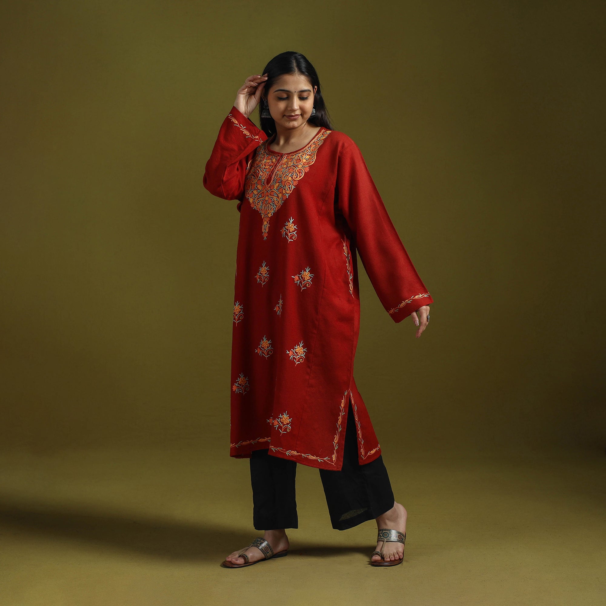 Maroon - Handwoven Aari Hand Embroidered Kashmiri Merino Wool Pheran with Palazzo Set 46