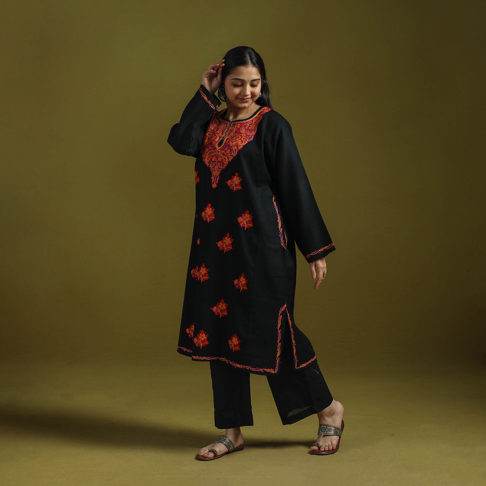 Maroon - Handwoven Aari Hand Embroidered Kashmiri Merino Wool Pheran with Palazzo Set 46