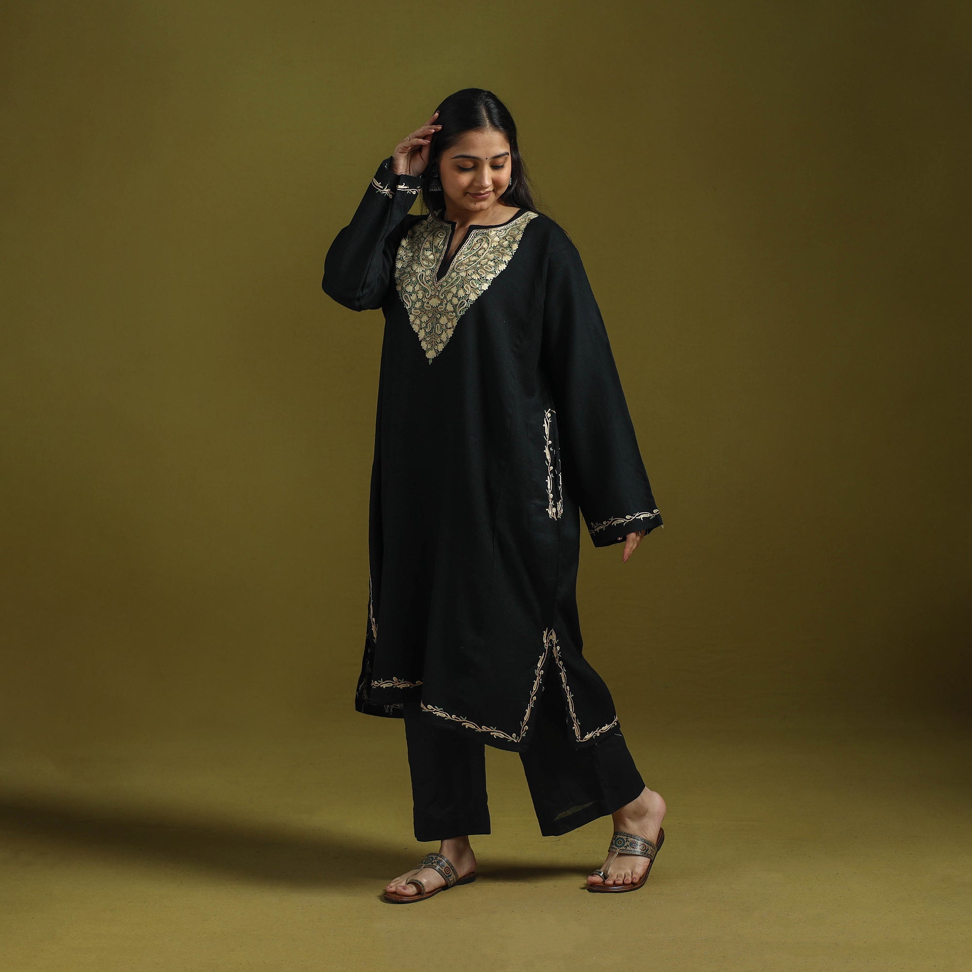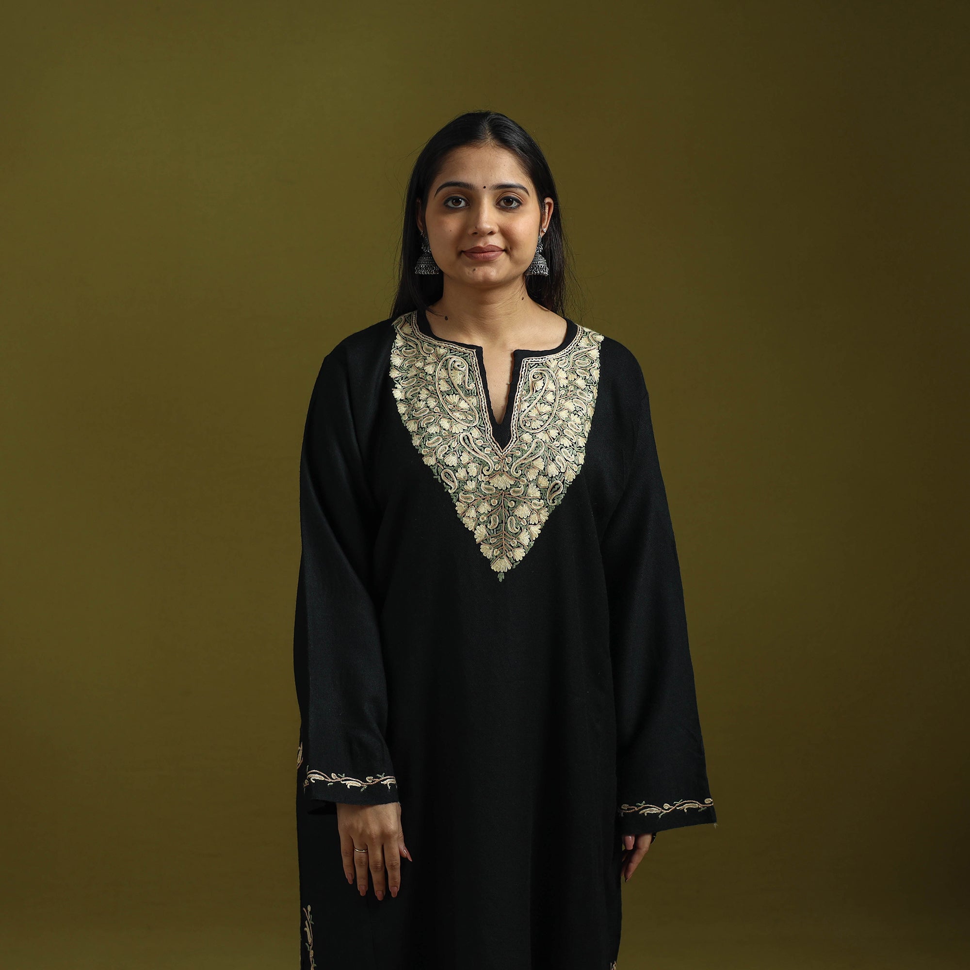 Maroon - Handwoven Aari Hand Embroidered Kashmiri Merino Wool Pheran with Palazzo Set 46