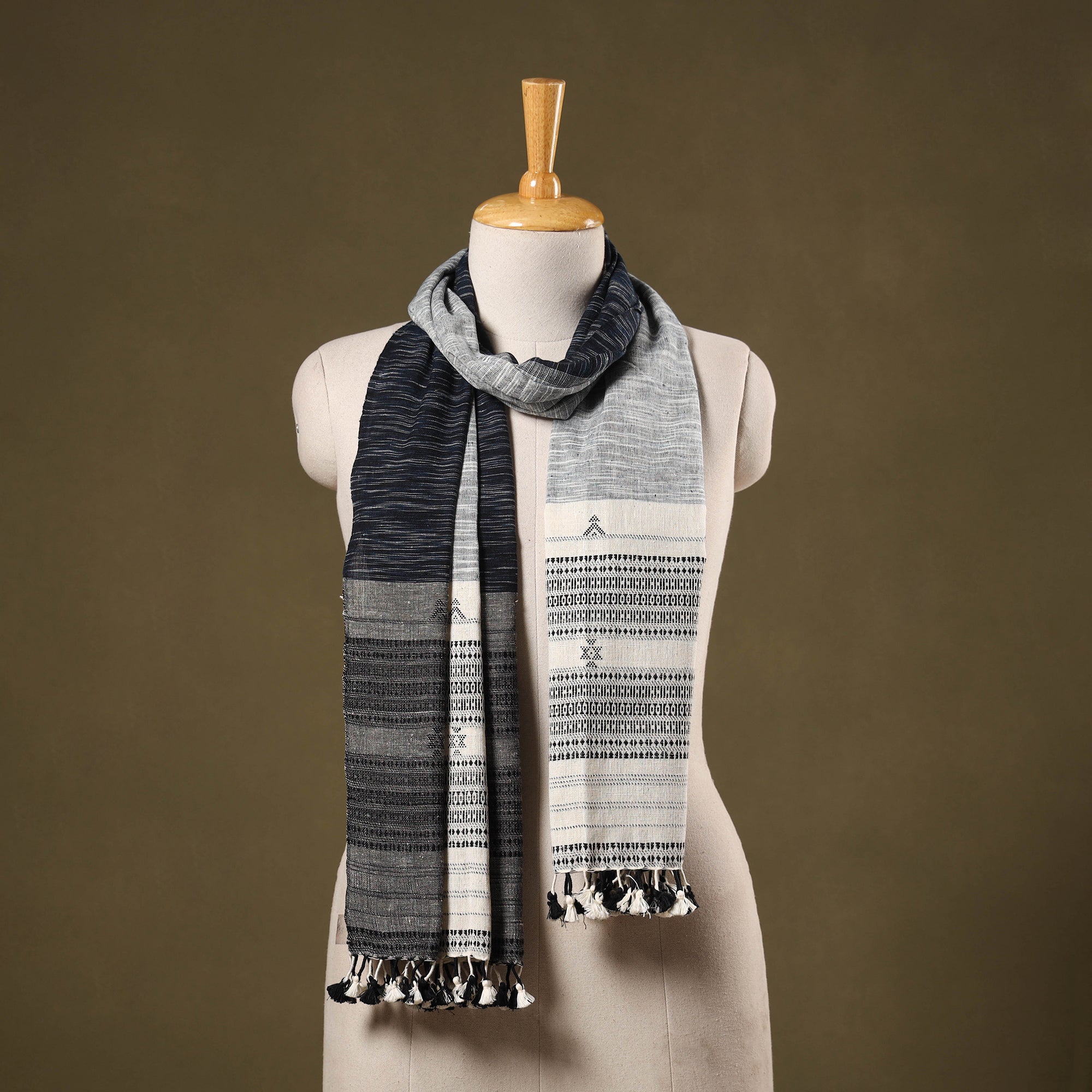 Celebrate the weaving legacy of Kutch with this black bhujodi stole, handwoven from organic kala cotton. Soft, breathable, and eco-conscious, it features traditional Bhujodi patterns and delicate tassels. A versatile piece that pairs effortlessly with kurtas, dresses, or festive wear crafted by skilled artisans to bring timeless elegance and sustainable style to your wardrobe.
