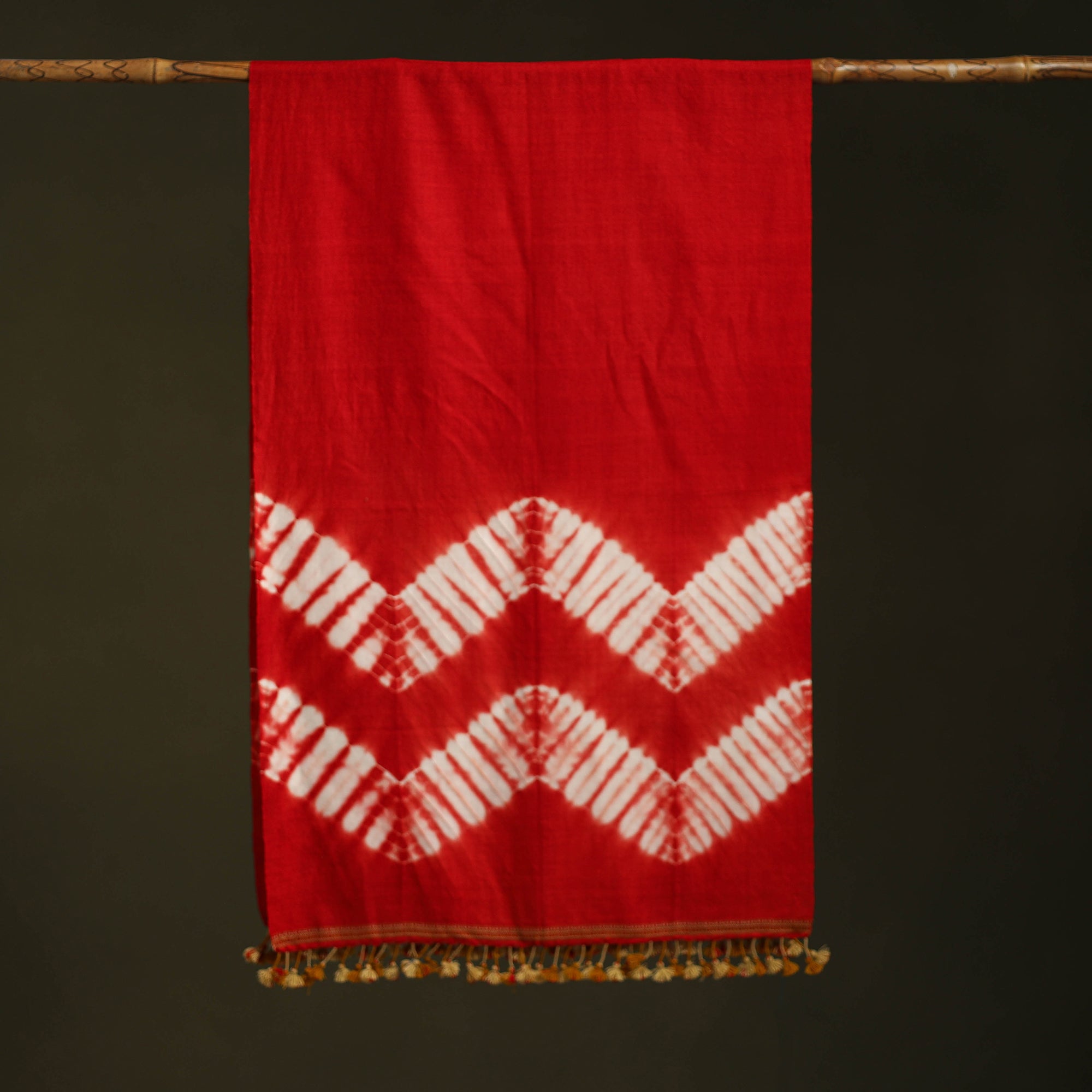 This red shibori stole, crafted from merino wool, offers natural warmth, softness, and an artisanal touch perfect for chilly weather. Handwoven in Kutch, it showcases the age-old shibori tie-dye technique, where the fabric is bound and dyed to create fluid, one-of-a-kind patterns. Lightweight yet cozy, it can be draped over kurtas, sarees, or layered with winter jackets for added style and comfort. Finished with tassels, it’s ideal for both everyday wear and festive occasions.