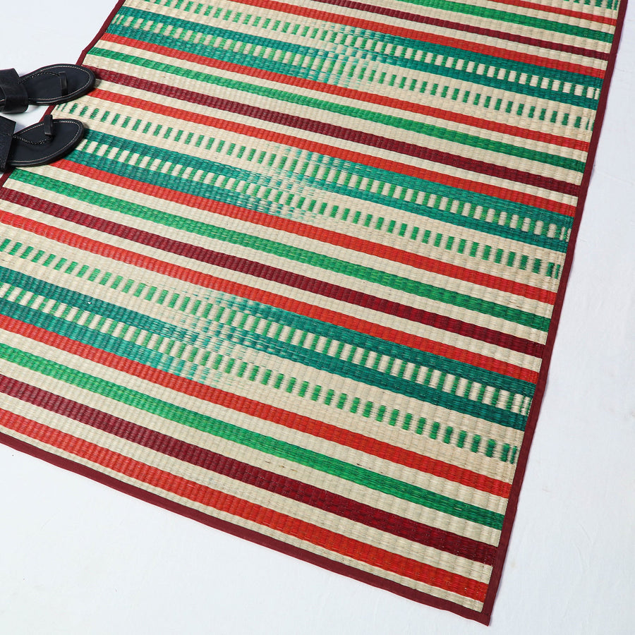 This handwoven pattamadai korai grass floor mat is crafted from Korai grass, a grass that grows in the marshy areas of Southern India. Known as Korai Pai in Tamil, the grass is soaked for four days, then shredded to extract the pulp, leaving only the husk. Dyed using dyes, it is handwoven into durable, eco-friendly mats that showcase natural aesthetics.