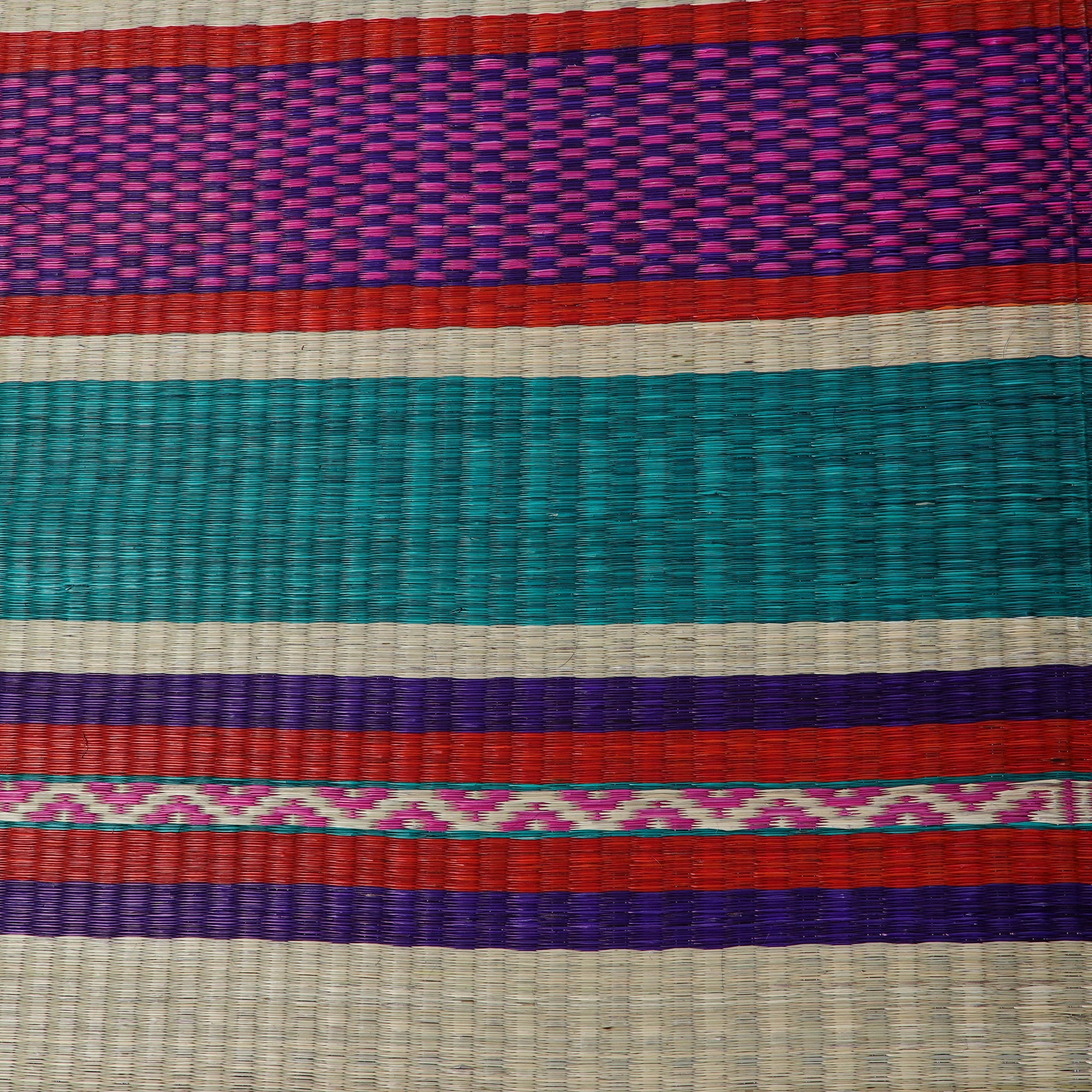 This handwoven pattamadai korai grass floor mat is crafted from Korai grass, a grass that grows in the marshy areas of Southern India. Known as Korai Pai in Tamil, the grass is soaked for four days, then shredded to extract the pulp, leaving only the husk. Dyed using dyes, it is handwoven into durable, eco-friendly mats that showcase natural aesthetics.