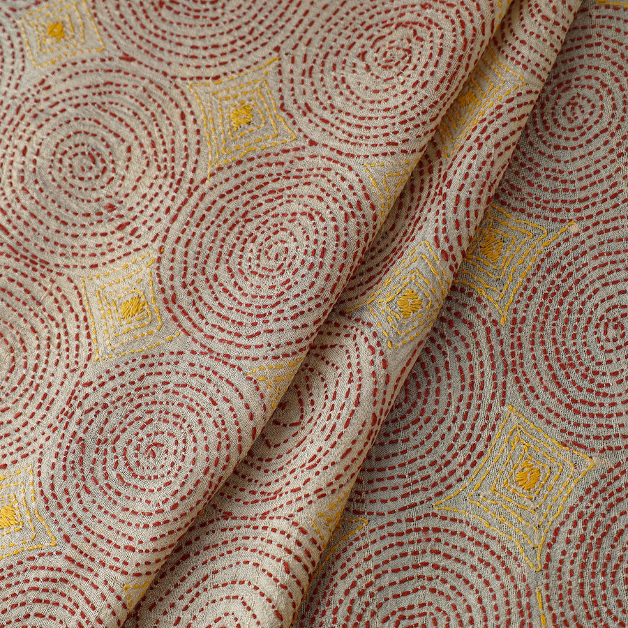 Indulge in the elegance of Bengal’s traditional artistry with handwoven pure tussar silk kantha work fabric. Master artisan Takdira Begum from Bolpur, West Bengal handweaves and hand-embroiders each piece, showcasing intricate patterns and a blend of silk's sheen and cotton's softness. Perfect for creating luxurious outfits or décor, these fabrics are eco-friendly and ethically crafted. Celebrate Bengal’s rich heritage with every purchase.