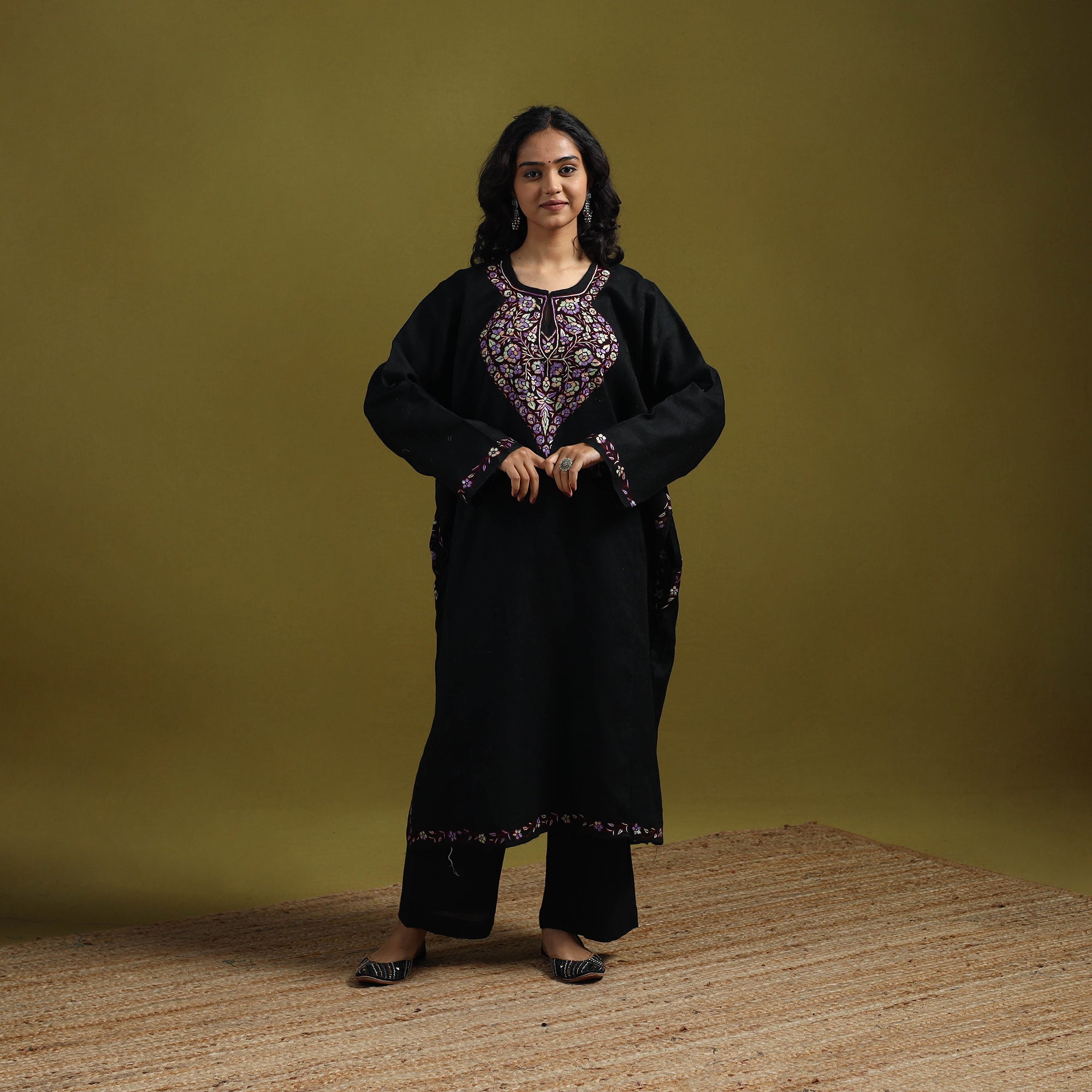 Handwoven pheran is crafted from soft merino wool and adorned with fine sozni hand embroidery, carefully made by skilled artisans Nakeeb, reflecting Kashmir’s rich textile heritage. The pheran features two side pockets for everyday comfort. Perfect for winter days as well as special occasions.