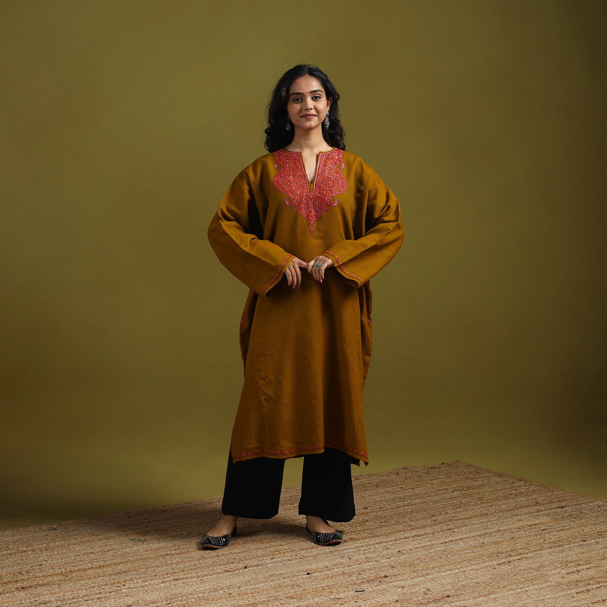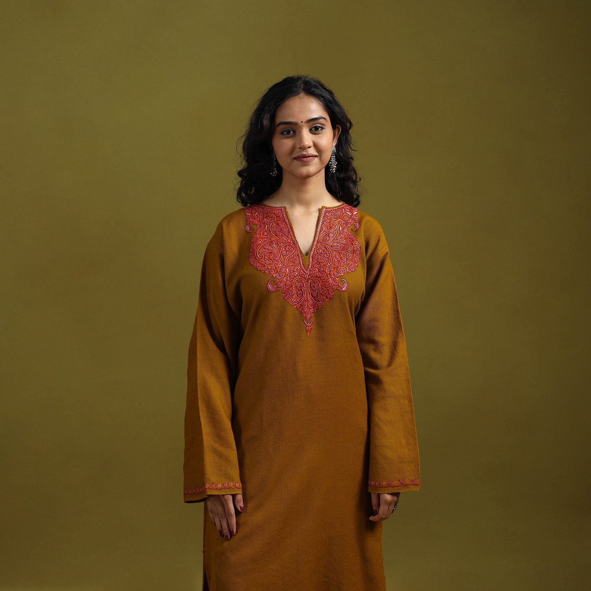 Brown handwoven pheran is crafted from soft merino wool and adorned with fine sozni hand embroidery, carefully made by skilled artisans Nakeeb, reflecting Kashmir’s rich textile heritage. The pheran features two side pockets for everyday comfort. Perfect for winter days as well as special occasions.
