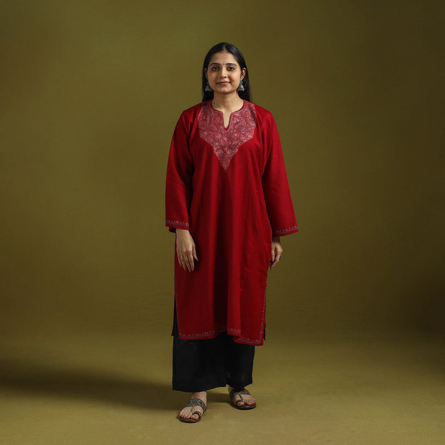 Maroon - Handwoven Aari Hand Embroidered Kashmiri Merino Wool Pheran with Palazzo Set 46
