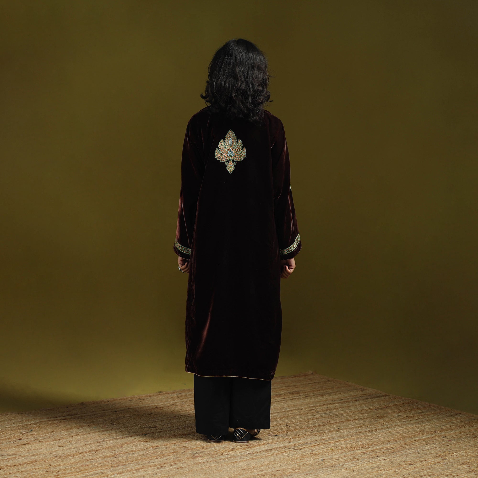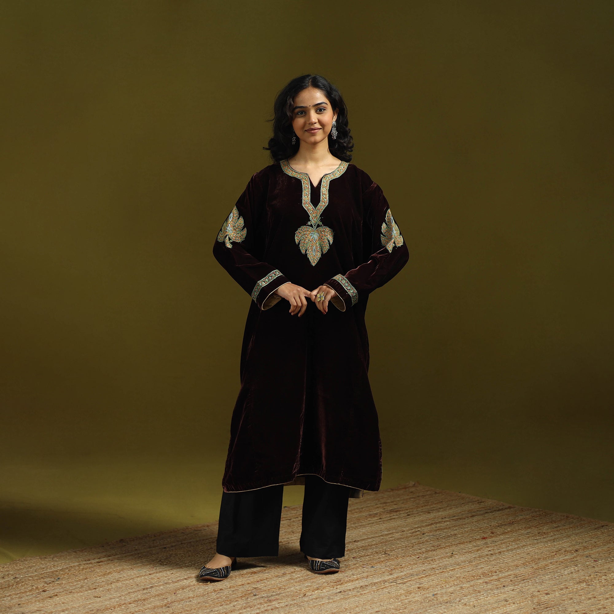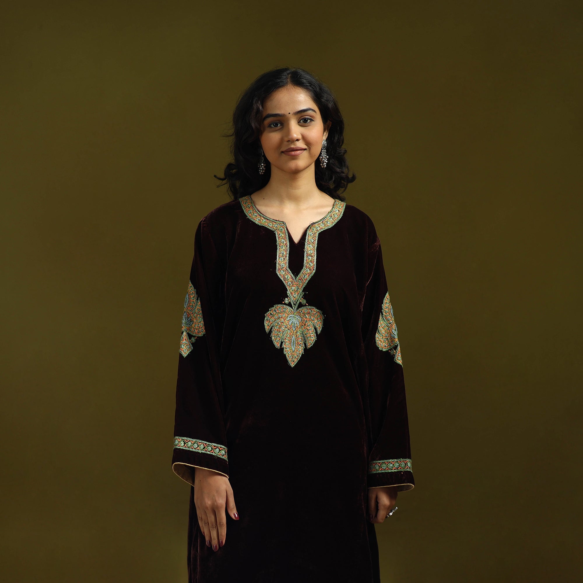 | Material | Handwoven pheran is crafted from soft velvet blended with merino wool and silk for added warmth. It is adorned with fine sozni hand embroidery, meticulously created by skilled artisans Nakeeb, reflecting Kashmir’s deep-rooted textile heritage. Designed with two side pockets for everyday comfort, this pheran is ideal for winter days as well as special occasions. |