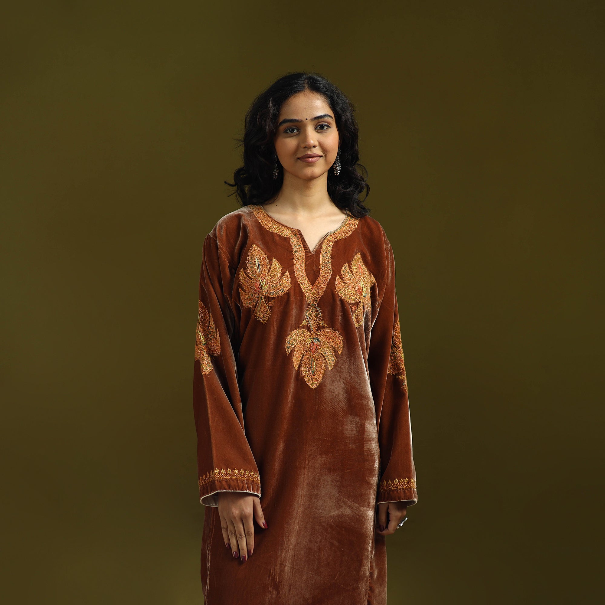 | Material | Handwoven pheran is crafted from soft velvet blended with merino wool and silk for added warmth. It is adorned with fine sozni hand embroidery, meticulously created by skilled artisans Nakeeb, reflecting Kashmir’s deep-rooted textile heritage. Designed with two side pockets for everyday comfort, this pheran is ideal for winter days as well as special occasions. |