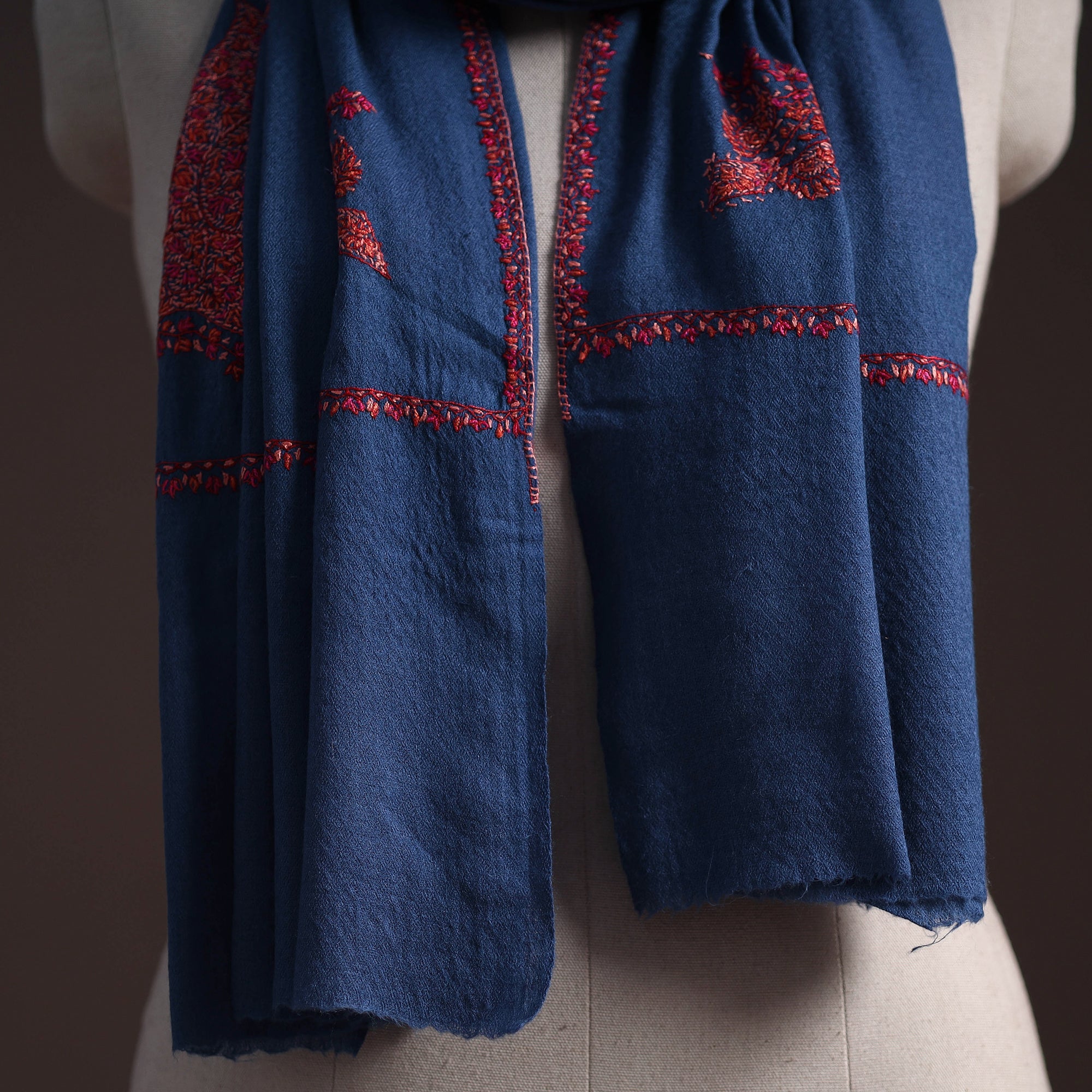 Merino wool stole features traditional sozni hand embroidery from Kashmir by skilled artisans Nakeeb, known for its fine and detailed work & carefully create delicate floral and paisley patterns that enhance the stole beauty without adding heaviness. The embroidery feels light and comfortable, making it easy to wear every day. With its elegant look and warm feel, this stole is perfect for winter use and also suits festive and special occasions.