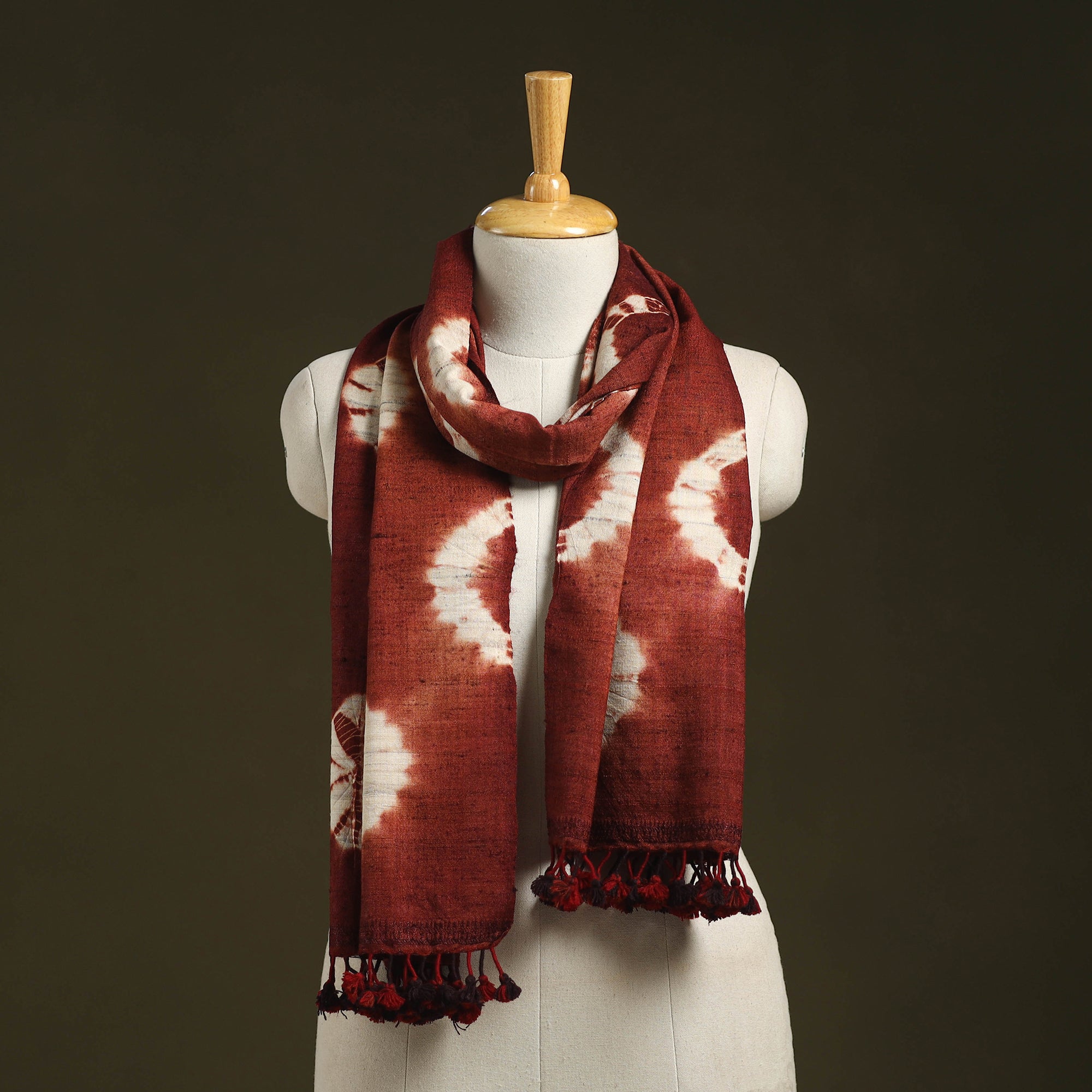 This brown shibori stole, crafted from a blend of tussar and merino wool, offers natural warmth, gentle softness, and an artisanal flair, perfect for chilly weather. Handwoven in Kutch, it features the traditional shibori tie-dye technique, where the fabric is meticulously bound and dyed to create fluid, one-of-a-kind patterns. Lightweight yet warm, it drapes beautifully over kurtas, sarees, or can be styled with winter jackets for added elegance and comfort. Finished with delicate tassels, it’s perfect for both daily wear and festive occasions.