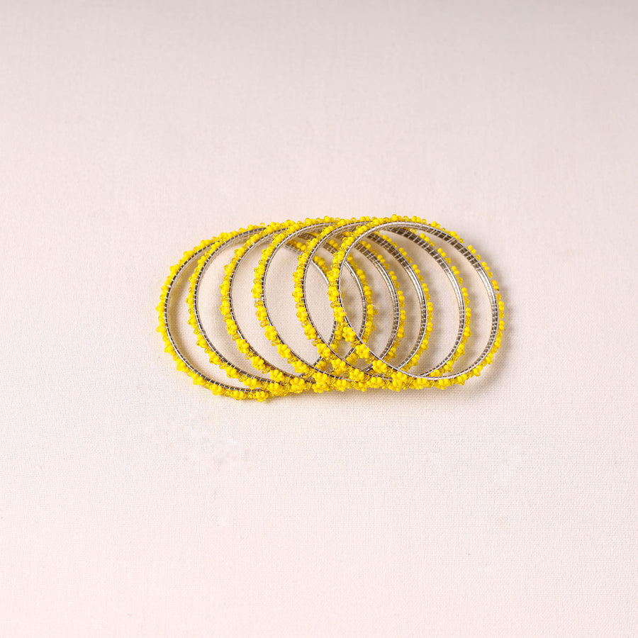 Adorn your wrists with these yellow hapur flower beadwork bangles by Aagaz (Set of 6). Each bangle is decorated with delicate beadwork, using high-quality glass beads and a sturdy metal base. The flower patterns are crafted and tied onto the bangle, making them a perfect accessory to enhance any traditional or festive attire.