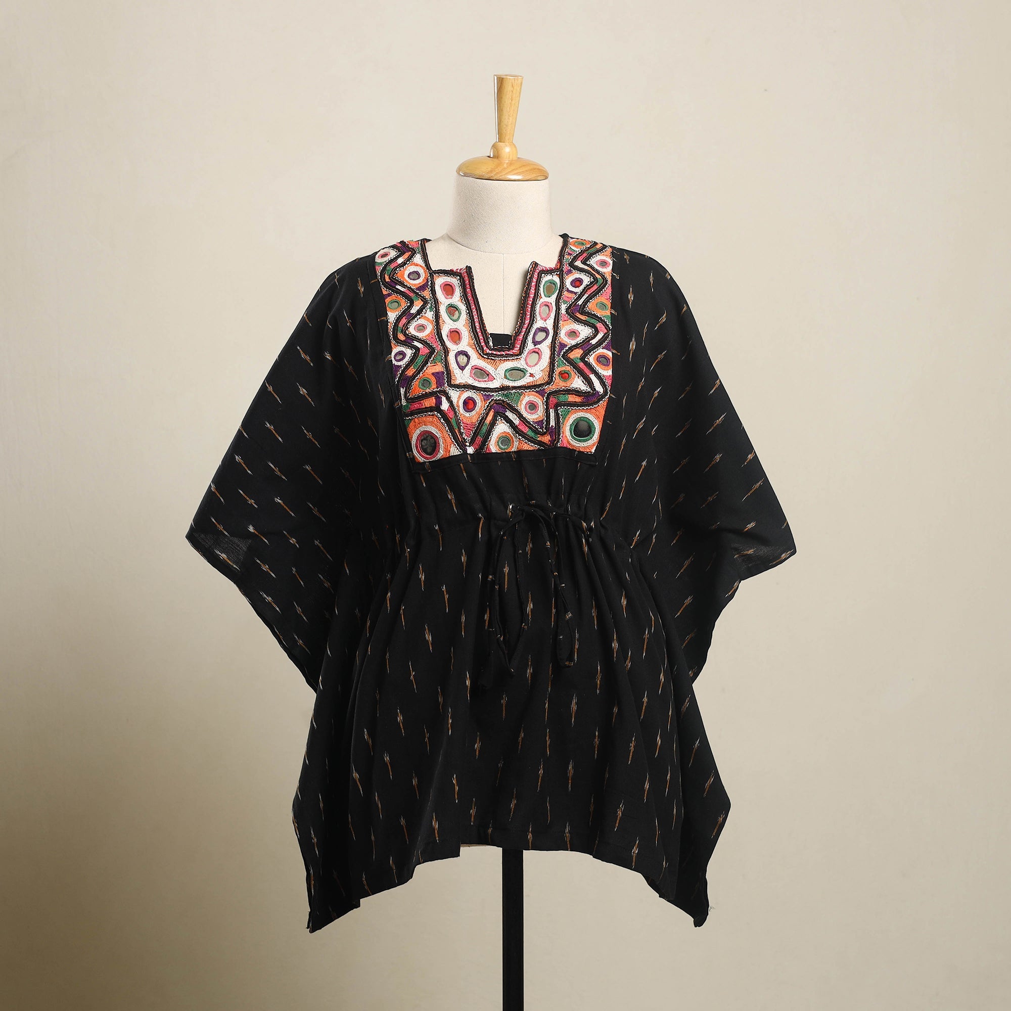 Stay stylish and comfortable with this black pochampally ikat cotton kaftan, adorned with delicate desert thread embroidery. Designed for a relaxed fit, this lightweight cotton kaftan features flowy sleeves and a drawstring waist for an adjustable silhouette. Perfect for lounging, beach outings, or casual wear, its soft fabric ensures all day comfort and effortless elegance.