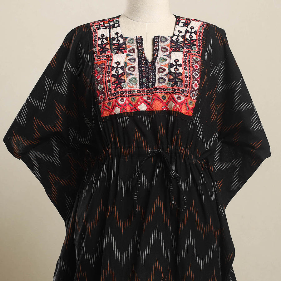 Stay stylish and comfortable with this black pochampally ikat cotton kaftan, adorned with delicate desert thread embroidery. Designed for a relaxed fit, this lightweight cotton kaftan features flowy sleeves and a drawstring waist for an adjustable silhouette. Perfect for lounging, beach outings, or casual wear, its soft fabric ensures all day comfort and effortless elegance.
