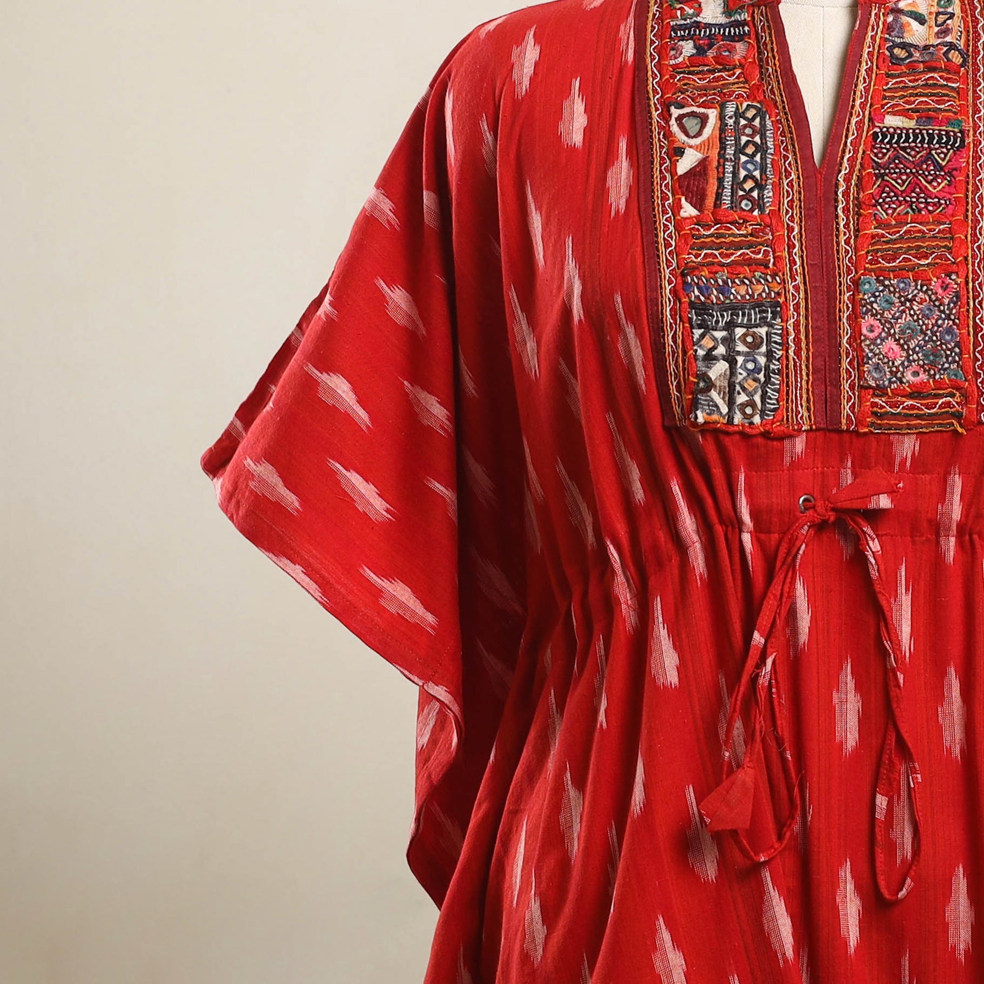 Stay comfy and stylish in this red pochampally Ikat cotton kaftan with desert thread embroidery. The short loose fitting design features with long flowing sleeves offering comfort. The drawstring waist tie allows you to customize the fit to your shape. Perfect for casual outings beach days or lounging at home this kaftan adds a traditional yet fashionable touch to your wardrobe.