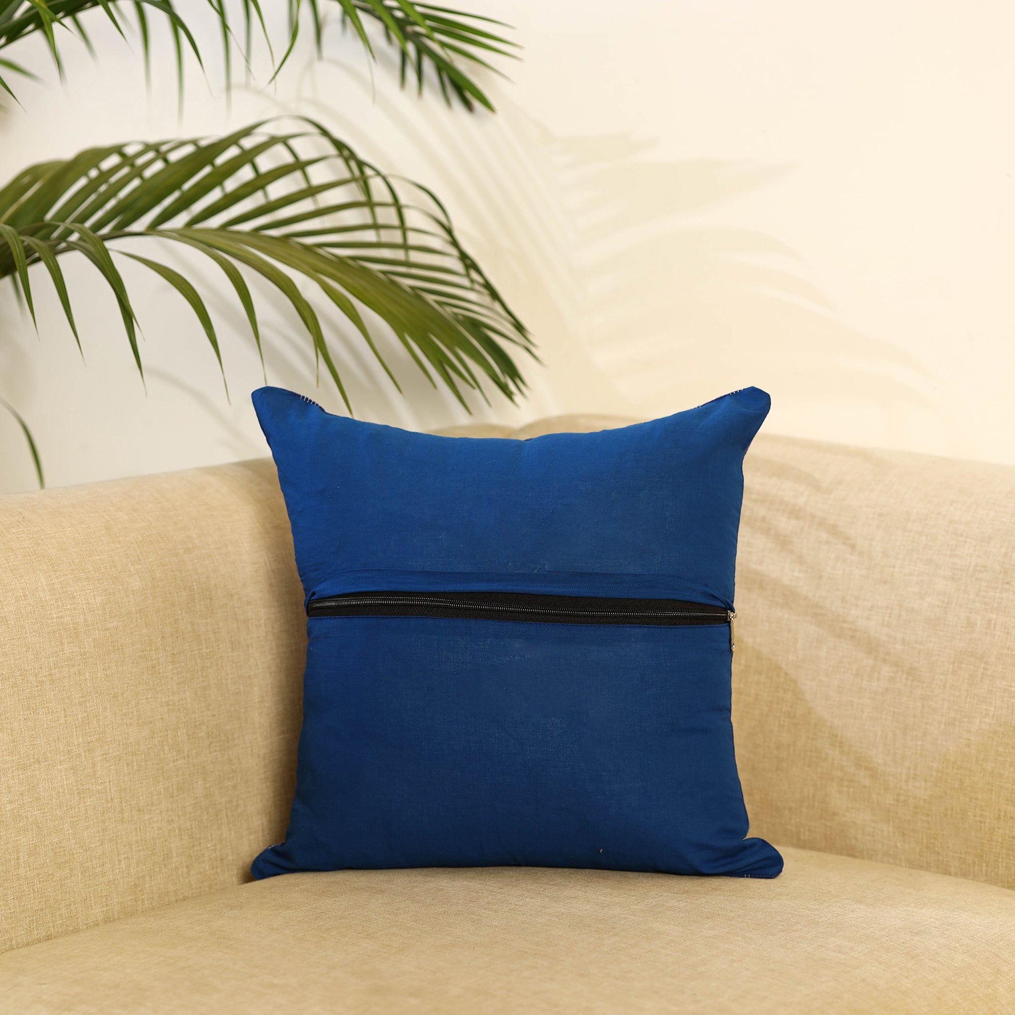 Give your home a stylish makeover with this blue ikat cotton and ajrakh modal silk patch cushion cover. Expertly handcrafted by artisans, it fuses beautiful designs with soft textures. A perfect choice for dressing up your sofa, cozy corners, bedroom chairs, or as a thoughtful gift.