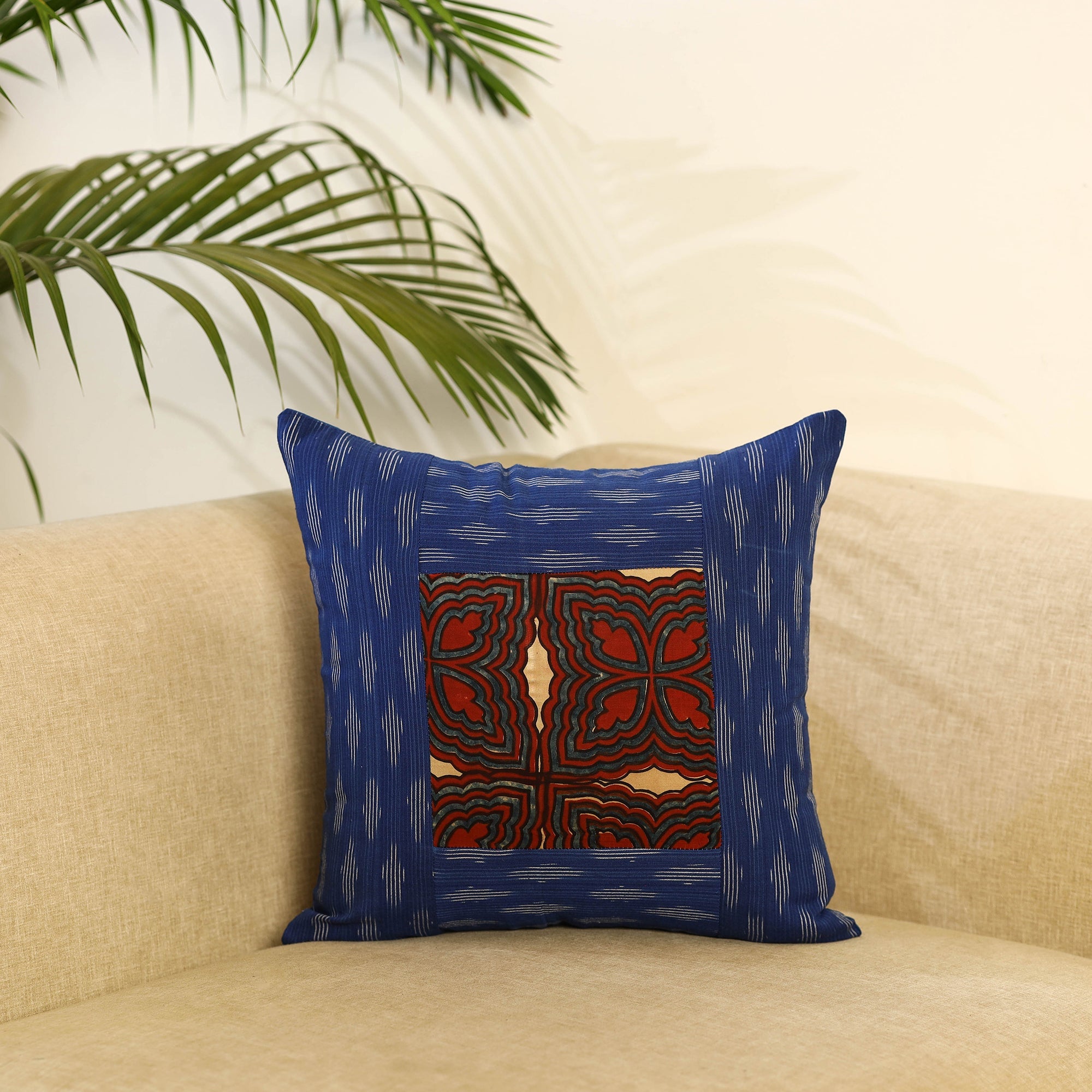 Give your home a stylish makeover with this blue ikat cotton and ajrakh modal silk patch cushion cover. Expertly handcrafted by artisans, it fuses beautiful designs with soft textures. A perfect choice for dressing up your sofa, cozy corners, bedroom chairs, or as a thoughtful gift.